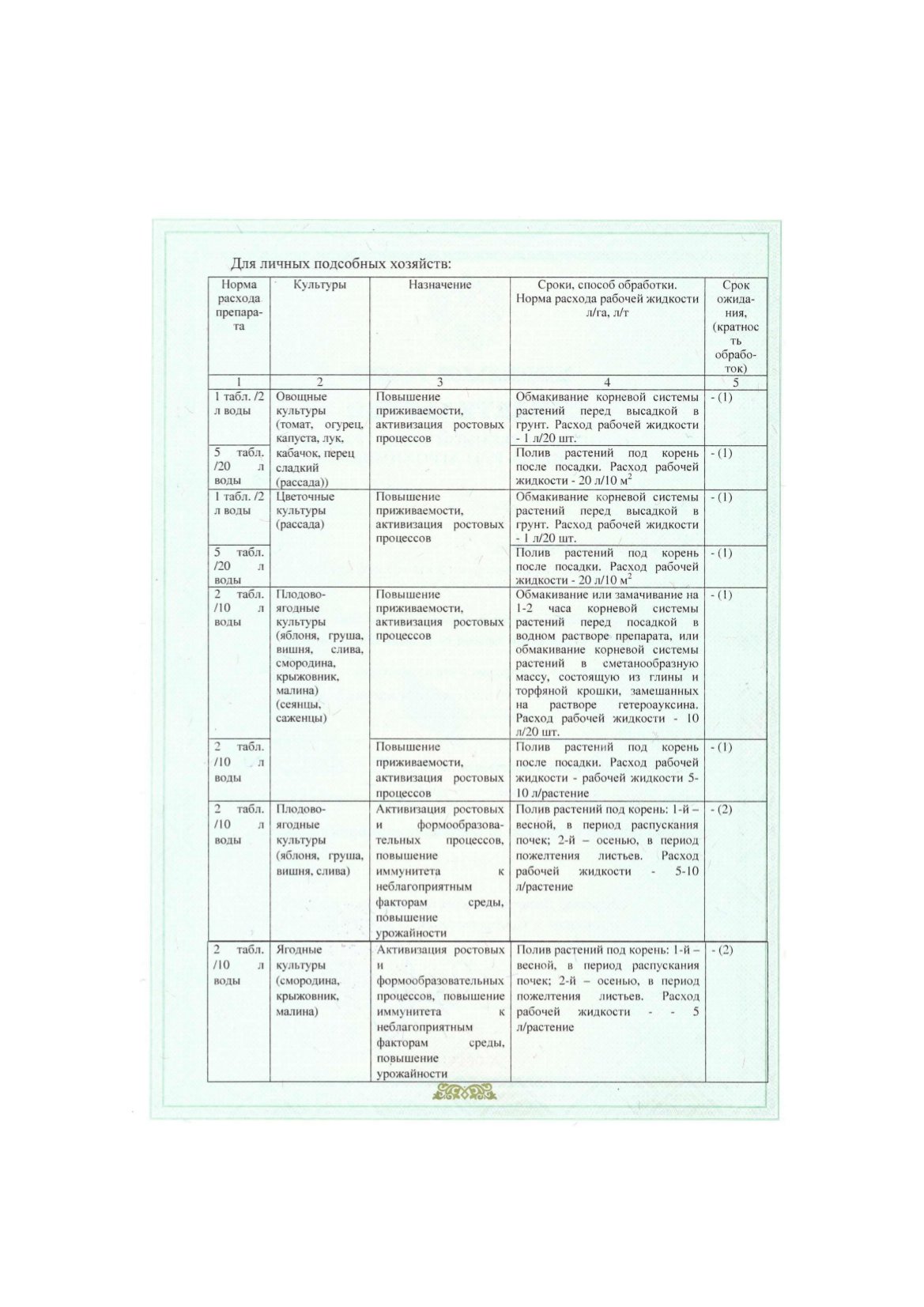 плодовые, ягодные и декоративные культуры(стимулирование корне-образования,ускорение сроков плодоношения, повышение урожайности)-2 таб. на 2 л воды(5 л 1 куст или 5-10 л на 1 дерево полив приствольных площадей)