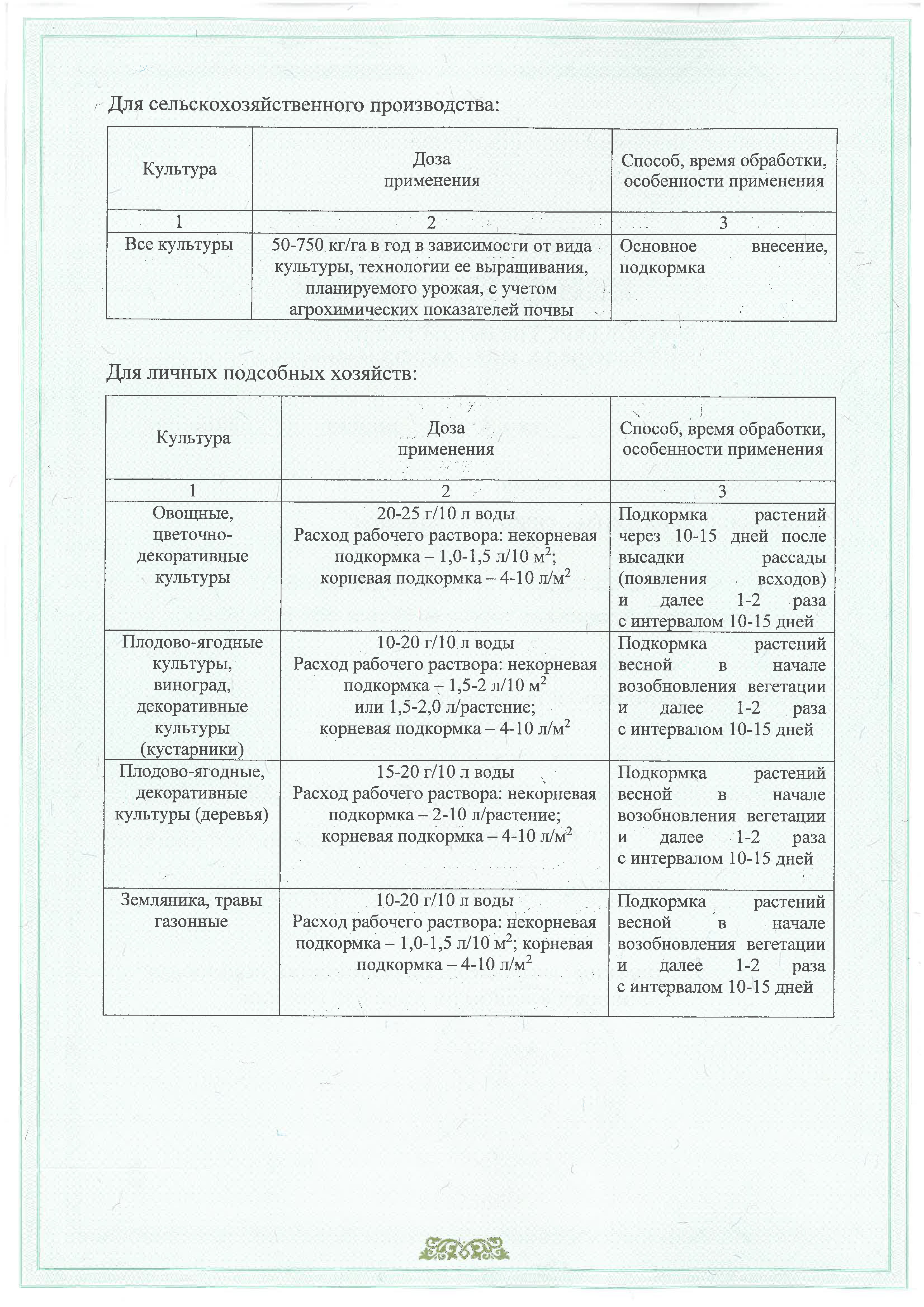 Расход рабочего раствора: корневая подкормка - 4-10 г/м2; некорневая подкормка - 1,5 л/20 м2 Подкормка 2-3 раза в начале вегетационного периода с интервалом 10-15 дней