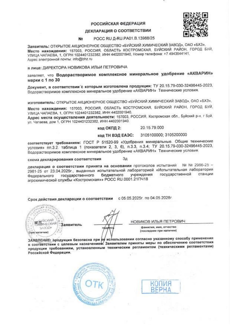 Доп.информация: азот (N) общий - 13,0 %, в т.ч. нитратный (N-NО3) – 7,0%, аммонийный (N-NH4) - 6,0% ЕС=1,4 мСм/см (0,1% раствор)