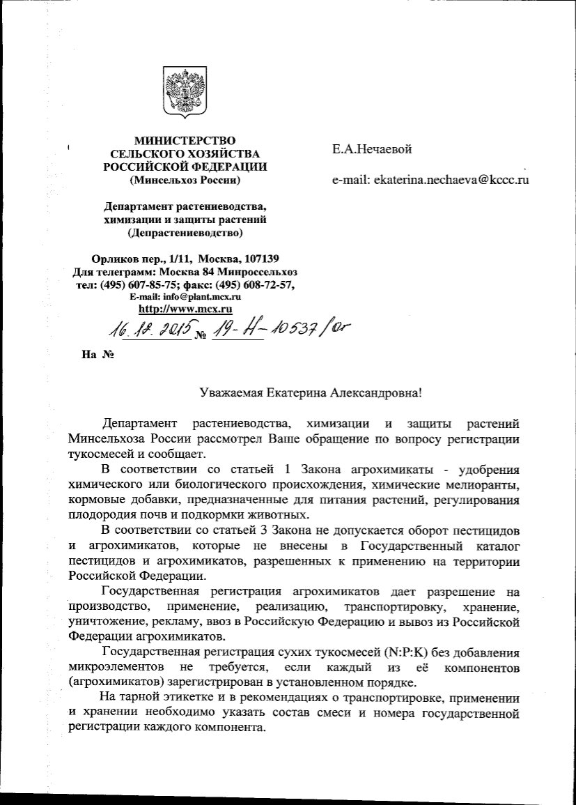 Состав: азот (N) - 15± 2%; фосфор (P2O5) - 30 ± 2%; калий ( K2O) – 15 ± 2%; магний MgO – 2 ± 0,5%; микроэлементов, не менее: бор (В) – 0,02%, медь (Сu) – 0,01%, железо (Fe) – 0,1%, марганец (Mn) – 0,05%, молибден (Мо) – 0,01%, цинк (Zn) – 0,01%.