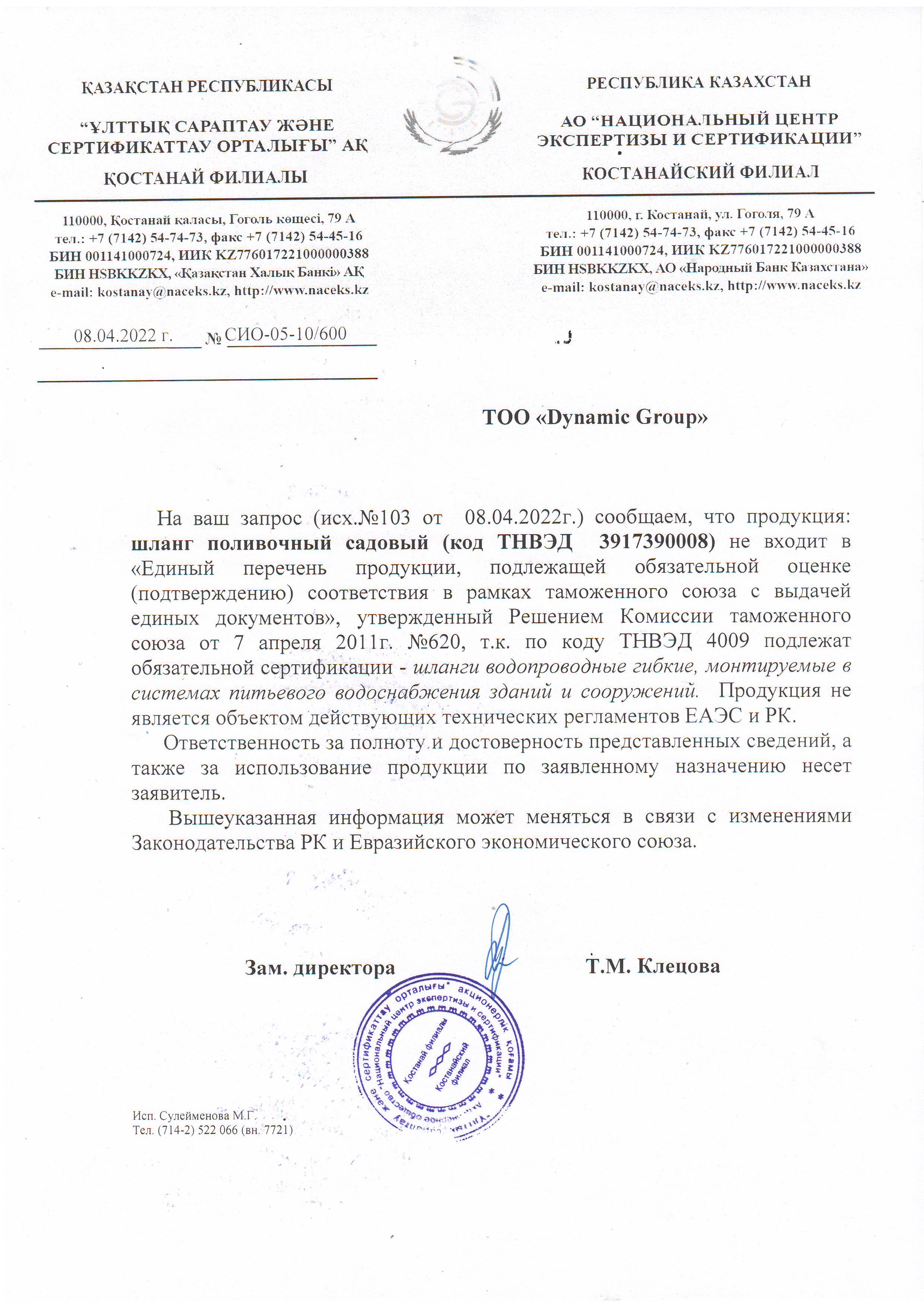 Сертификация-информационное письмо №СИО-05-10/600 от 08.04.22 выдано АО "Национальный центр экспертизы и сертификации"