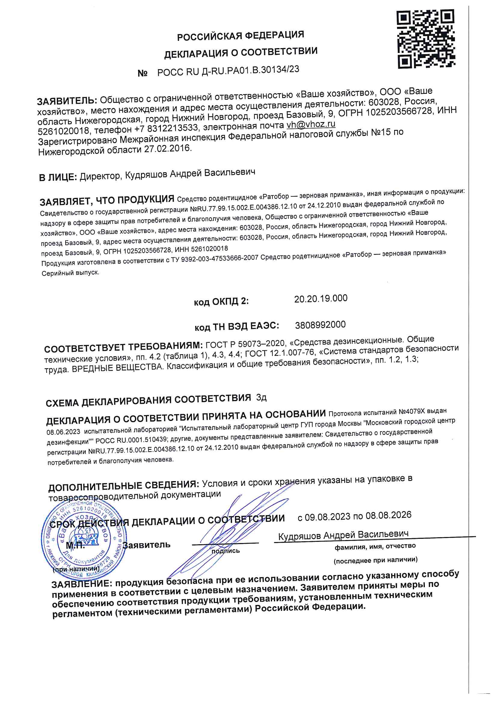 Меры предосторожности: применять и хранить в местах, недоступных для детей и животных. Работать в перчатках, не курить, не пить. Упаковку и остатки приманки сжигают или закапывают. После работ вымыть руки водой с мылом. При попадании в желудок — немедленно (не позднее 30 мин) вызвать рвоту, обратиться к врачу. Антидот — витамин К1 или К3. До осмотра врача не есть, выпить 3–4 стакана воды с 10–12 таблетками активированнго угля. ТОКСИЧНО! Требуется защита кожных покровов! Хранение: в сухом месте, отдельно от пищевых продуктов.