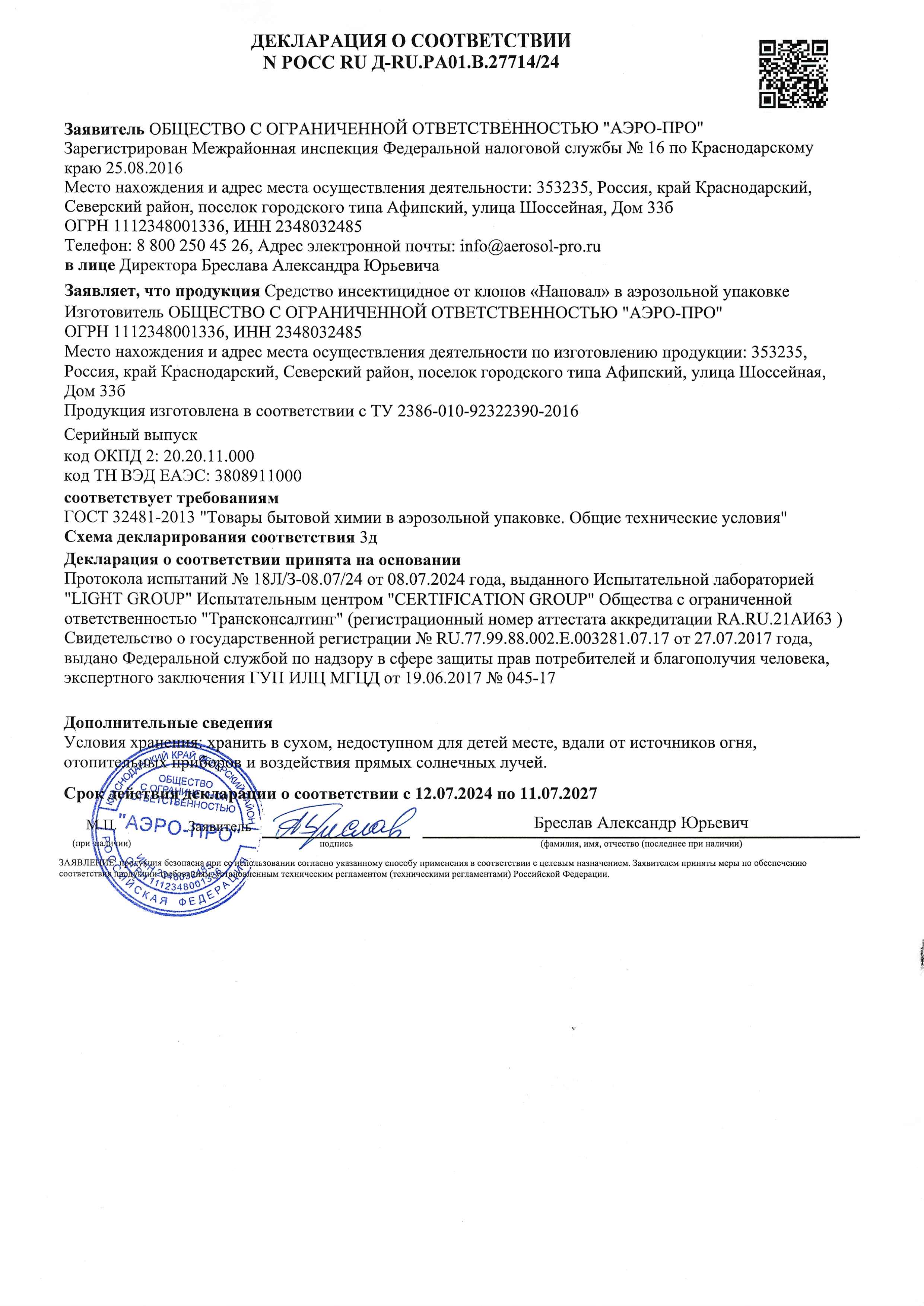 Состав: тетраметрин 0,2%, имидаклоприд 0,05%, синергист, отдушка, растворитель, углеводородный пропеллент.