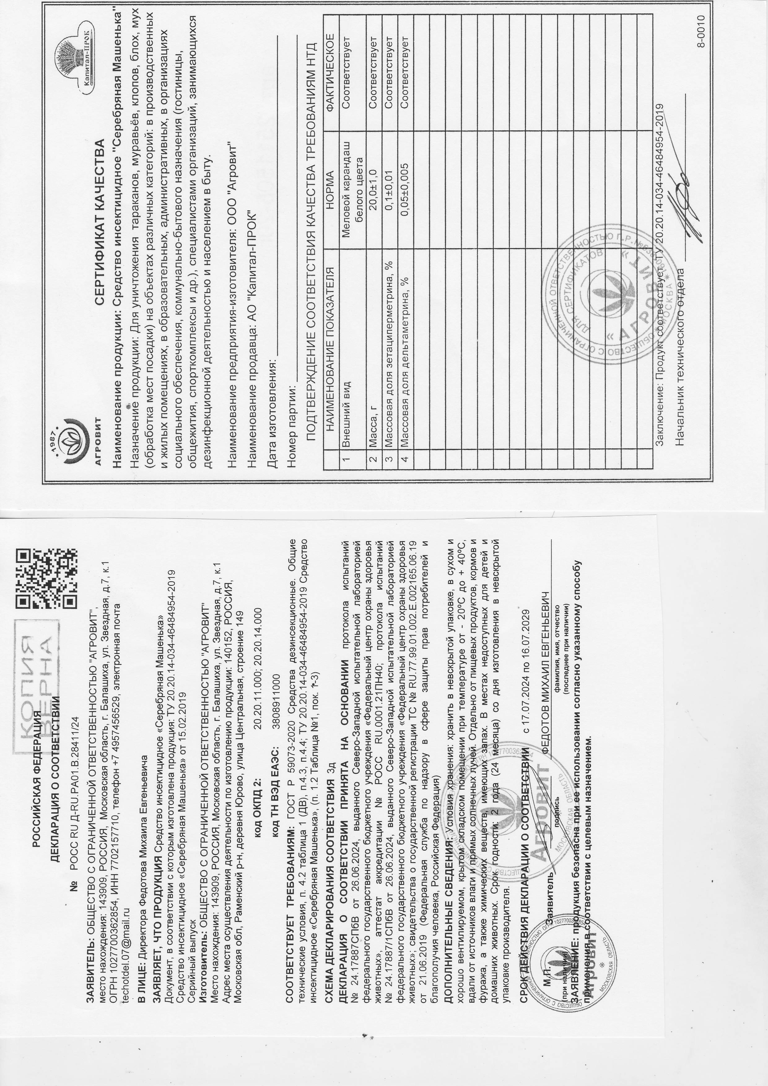 Зетациперметрин – 0,1%, дельтаметрин – 0,05%, гипс, мел.