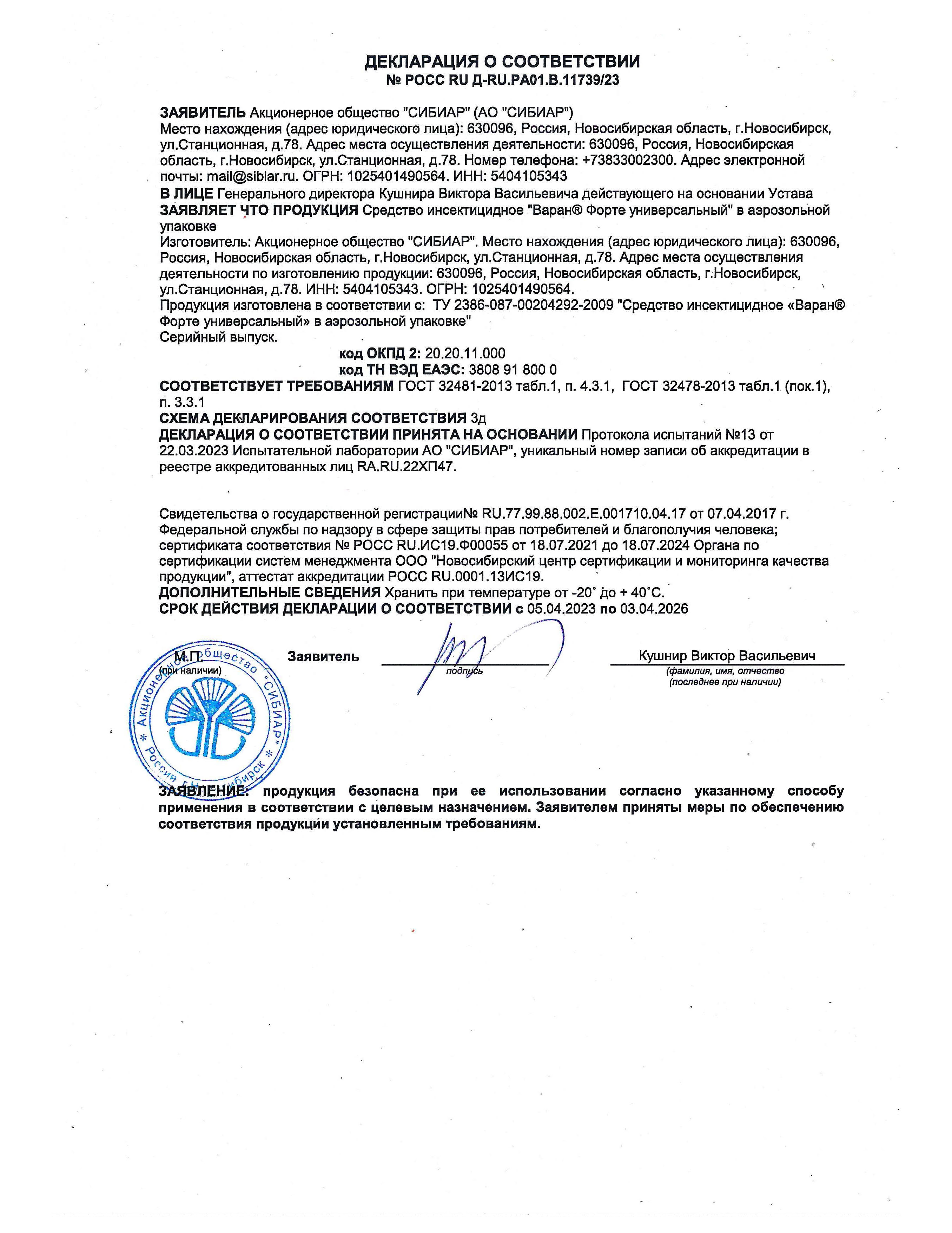Срок годности 5 лет. Хранить при температуре от минус 20 до плюс 40°С отдельно от пищевых продуктов, лекарственных средств, в местах, недоступных детям и домашним животным!