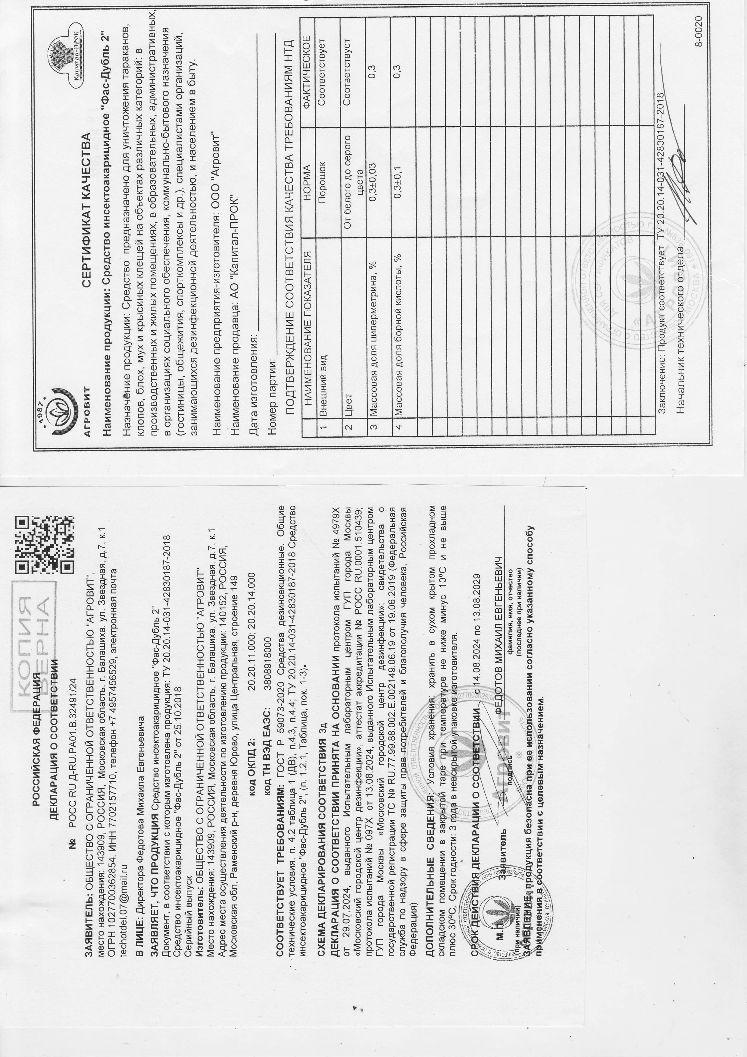 Инсектицидное средство Фас-дубль 2 представляет собой порошок от белого до серого цвета. Удобная упаковка (пакет-опыливатель) позволяет использовать препарат экономно и эффективно. Благодаря введению нового современного ДВ препарат дополнительно приобрел инсекто-акарицидные свойства: теперь активен не только против клопов, тараканов, муравьев, блох, мух, но и крысиных клещей - основных переносчиков вируса АЧС. Средство обладает острым инсектоакарицидным действием и остаточной активностью в течение 4-6 недель в отношении бытовых насекомых: