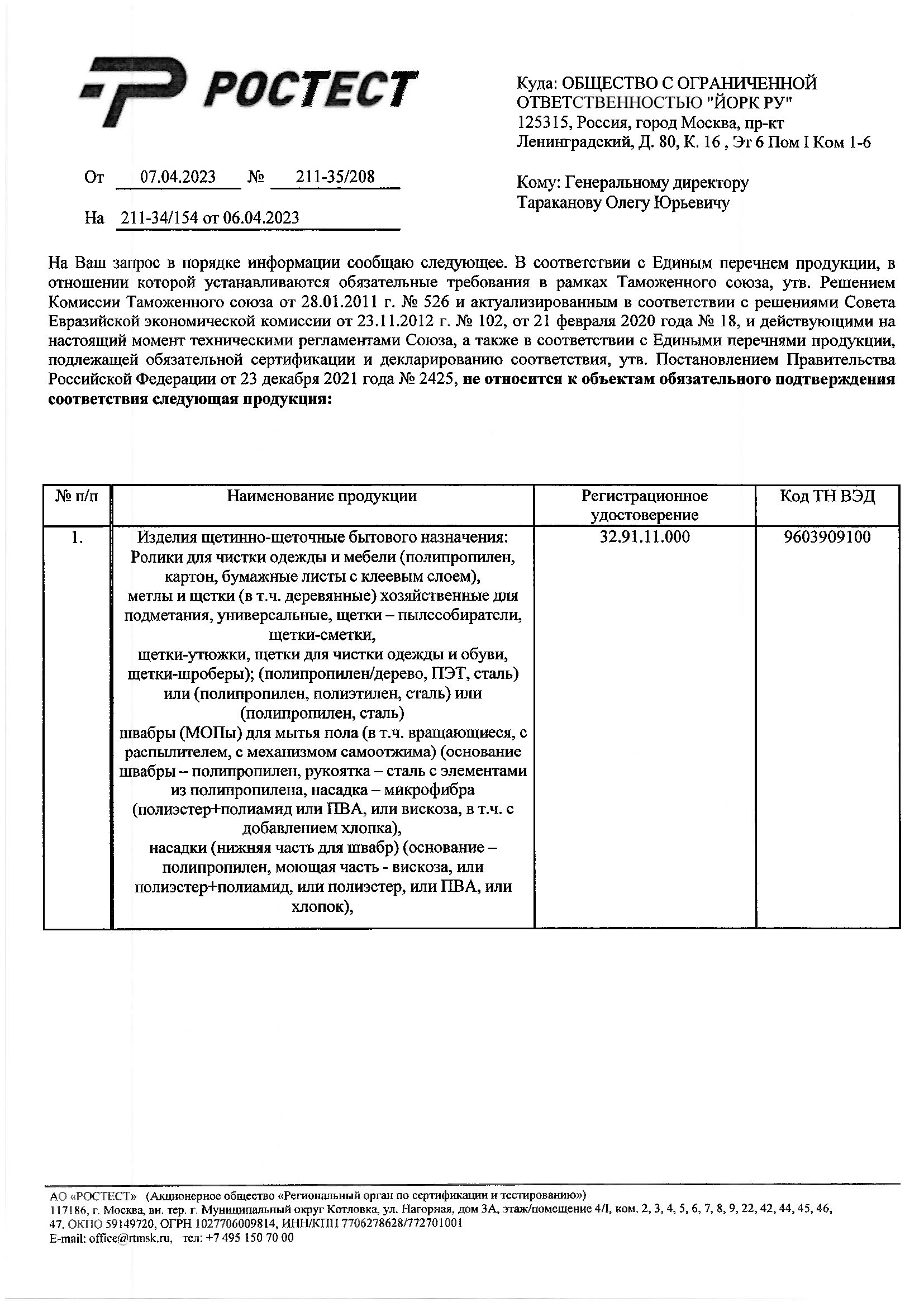 Сертификация-информационное письмо №211-35/208 от 07.04.23 выдано ОС продукции АО "РОСТЕСТ"