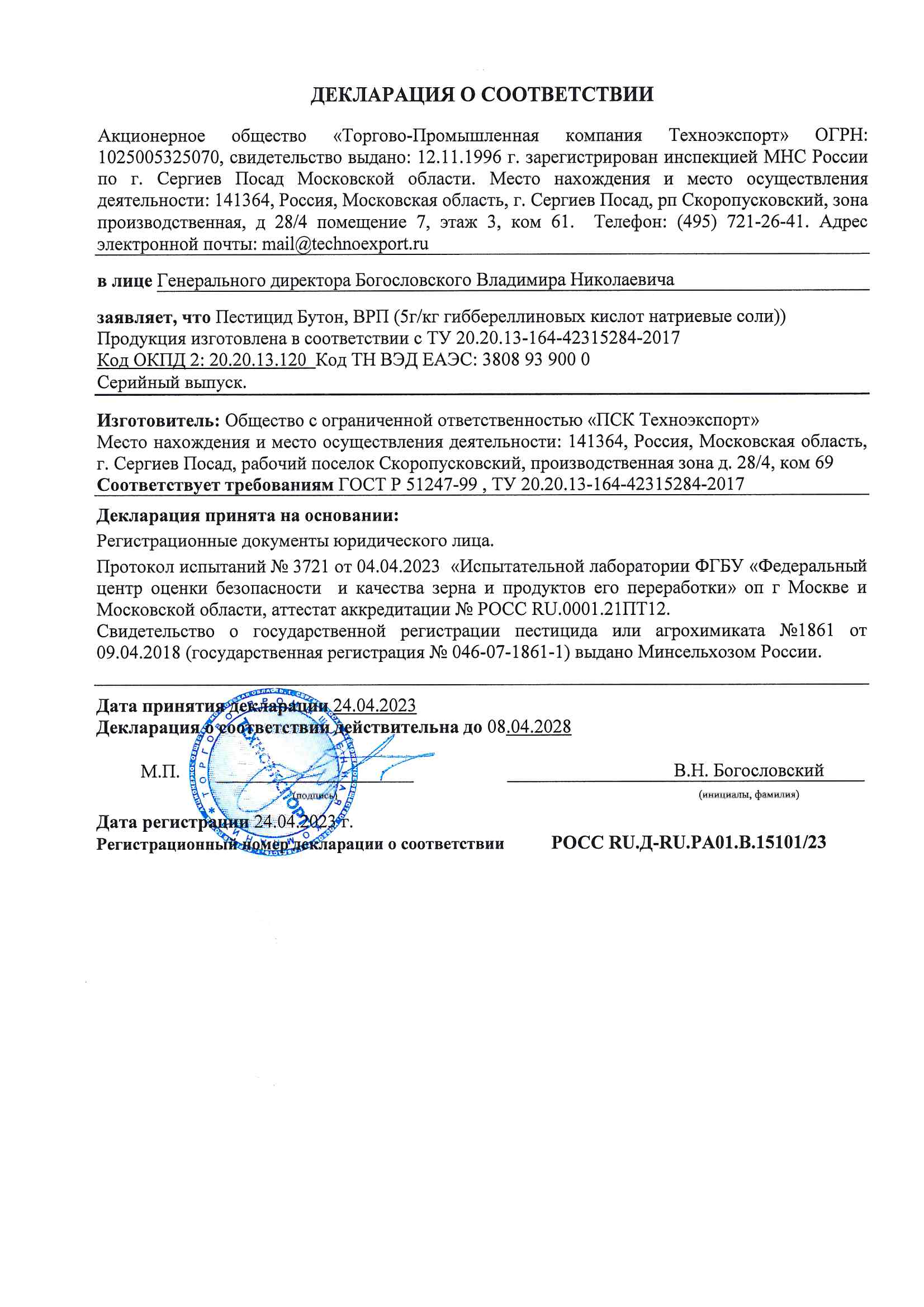 Государственная регистрация-№046-07-1861-1 от 09.04.18 до 08.04.28 выдана МСХ РФ, Сертификация-декларация №РОСС RU Д-RU.РА01.В.15101/23 от 24.04.23 до 08.04.28 выдана Заявитель: АО "ТПК "Техноэкспорт"