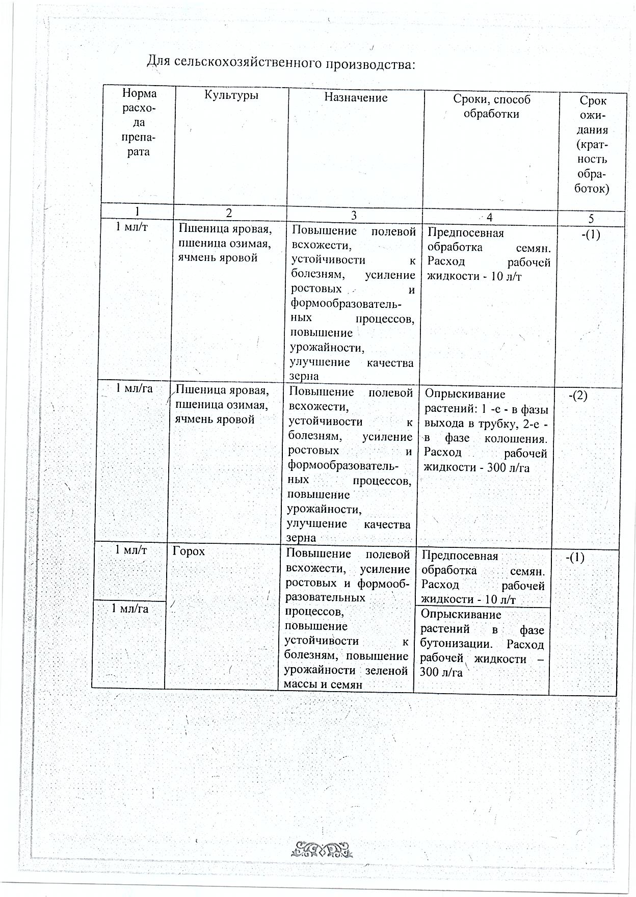 Горох 0,02 мл (1 капля) на 200 мл воды Повышение всхожести семян, увиличение урожайности и зеленой массы. Предпосевная обработка семян. Расход - 200 мл/100 гр семян