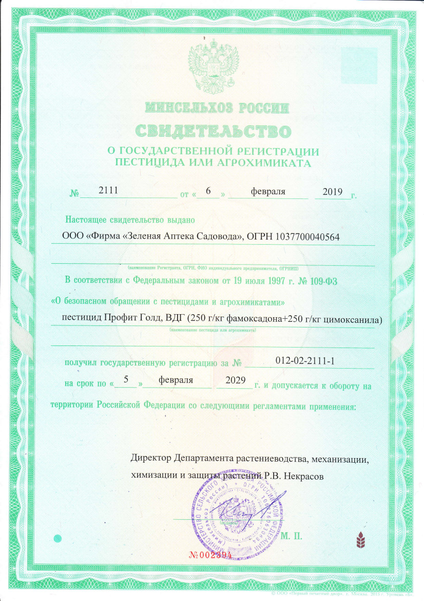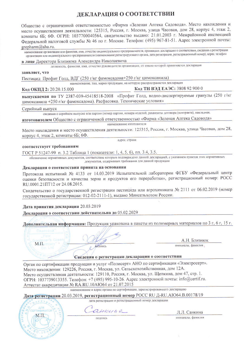 Государственная регистрация №012-02-2111-1 от 06.02.19 до 05.02.29 выдана МСХ РФ; Сертификация-декларация №РОСС RU Д-RU.АЮ64.В.00178/19 от 20.03.09 до 05.02.29 выдана ОС продукции и услуг "Полисерт" АНО по сертификации "Электросерт"