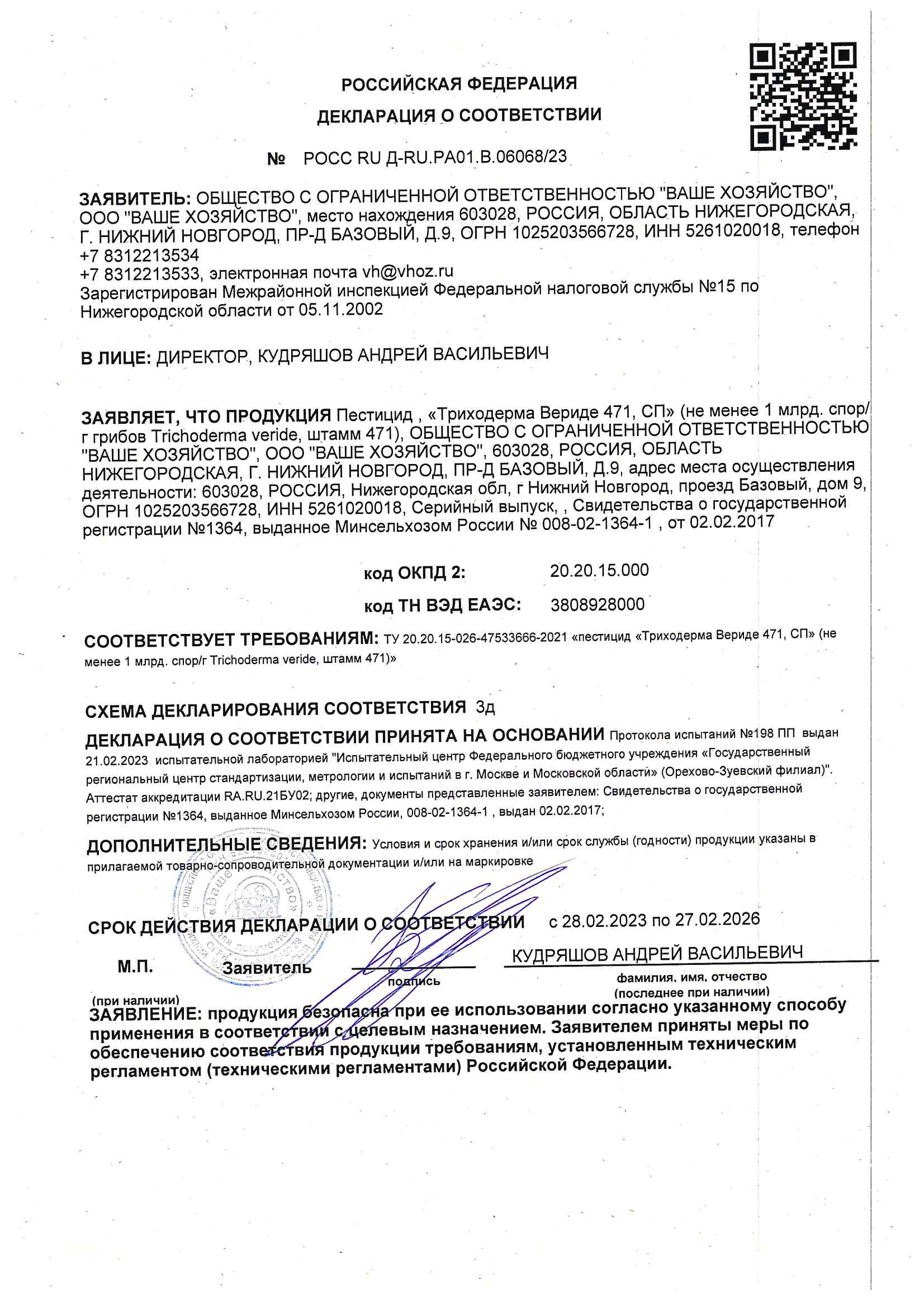 Содержит: спорово-мицелиальная масса гриба Триходерма вериде, штамм 471 ГНУ ВНИИСХМ РАСХН, титр не менее 1 млрд. спор/г, смачивающийся порошок.