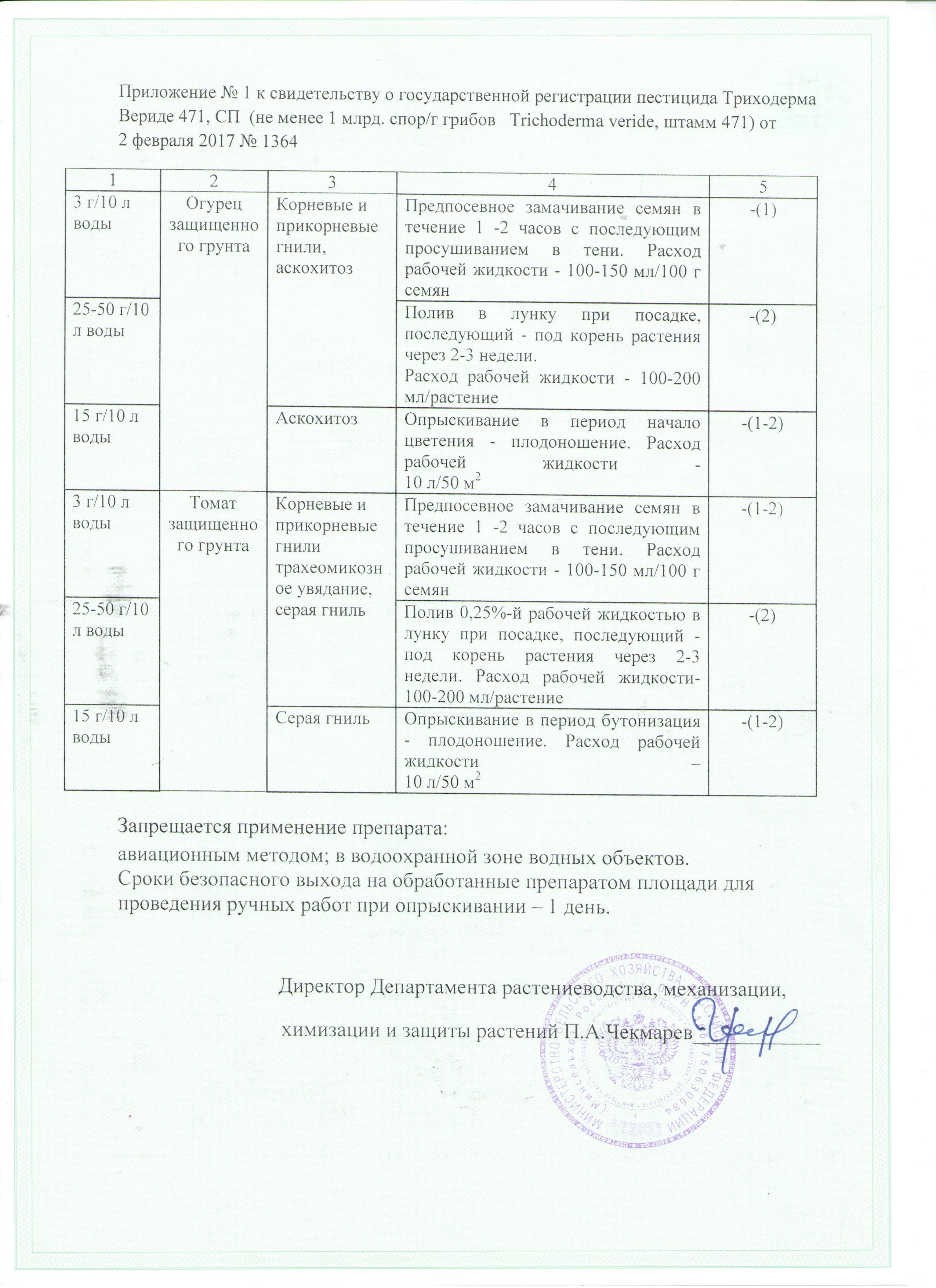 Меры безопасности: Фунгицид для протравливания семян и профилактической обработки растений от болезней, биологической дезинфекции почвы в защищённом грунте, стимулятор всхожести. Период защитного действия: от предпосевной обработки семян и до окончания вегетационного периода развития растений. Скорость воздействия: подавляет фитопатогенные грибы в начальный период их развития, не нарушая роста растений. Не фитотоксичен. Препарат не патогенен и не токсичен для полезной энтомофауны. Первая помощь: при попадании в глаза — промыть большим количеством воды; на кожу — промыть загрязненные места водой с мылом; через органы дыхания — вывести пострадавшего на свежий воздух; лечение: при необходимости — под наблюдением врача. Способы обезвреживания пролитого или рассыпанного пестицида, утилизации тары и остатков. Все мероприятия по обезвреживанию тары, пролитых препаратов проводить с использованием СИЗ. Тару, в которой готовились рабочие растворы, дезинфицировать 10–20% водным раствором известкового молока. Препарат, пришедший в негодность, неиспользованные растворы и пролитые препараты дезинфицировать 0,5–3% раствором хлорамина или 10–20% водный раствором известкового молока.