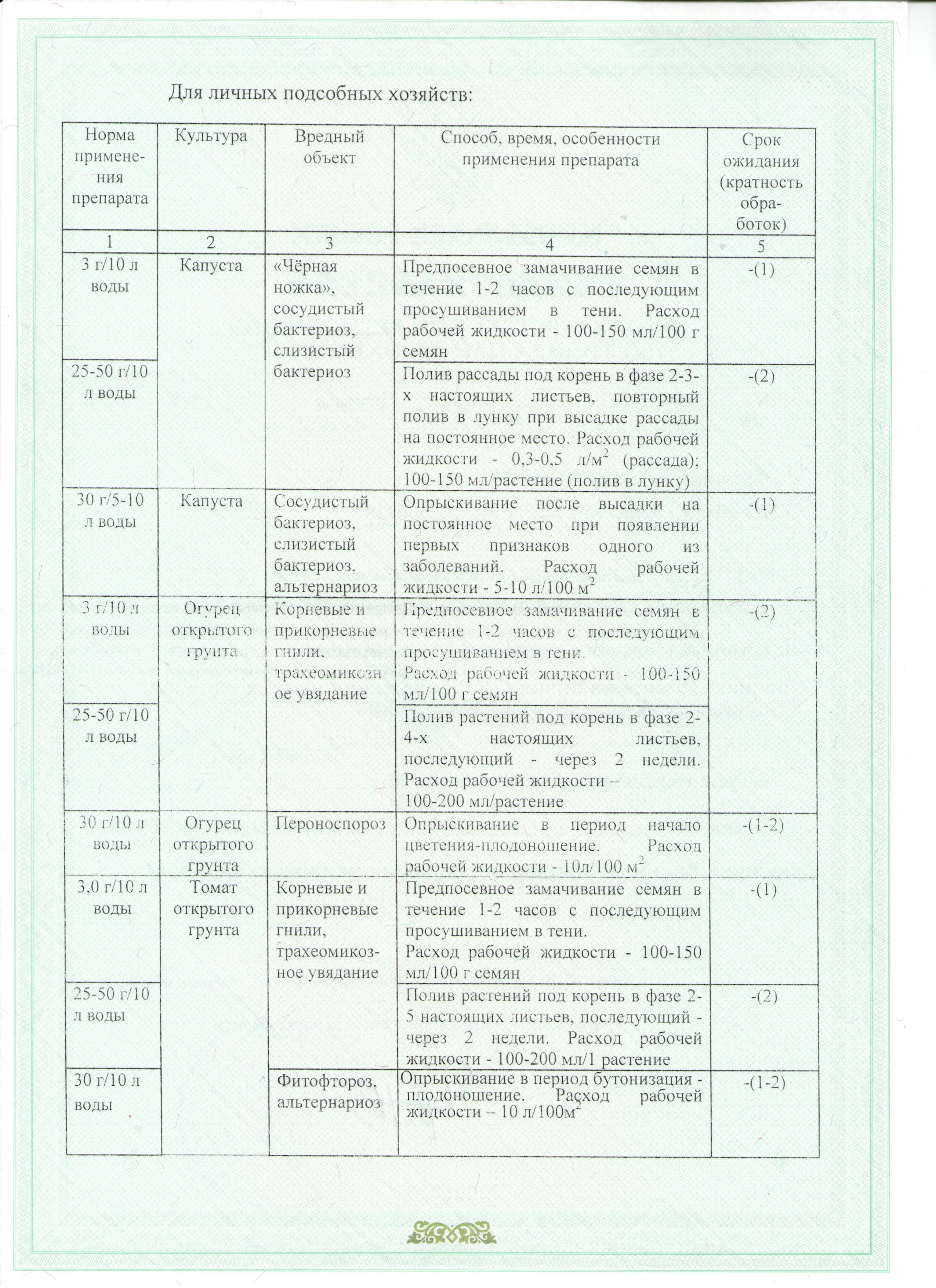 Капуста «чёрная ножка», сосудистый и слизистый бактериоз 30 г / 10 0,3–0,5 л на м² (рассада) 100-150 мл на растение Полив рассады под корень в фазе 2–3 настоящих листьев, повтор — в лунку при высадке 2
