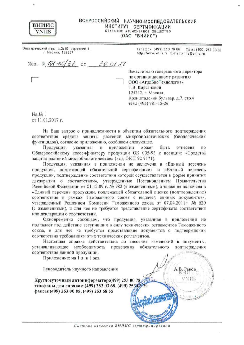 Государственная регистрация №139-02-2260-1 от 03.05.19 до 02.05.29 выдано МСХ РФ; Сертификация- информационное письмо №101-кс/22 от 20.01.17 ОС продукции ОАО "ВНИИС"