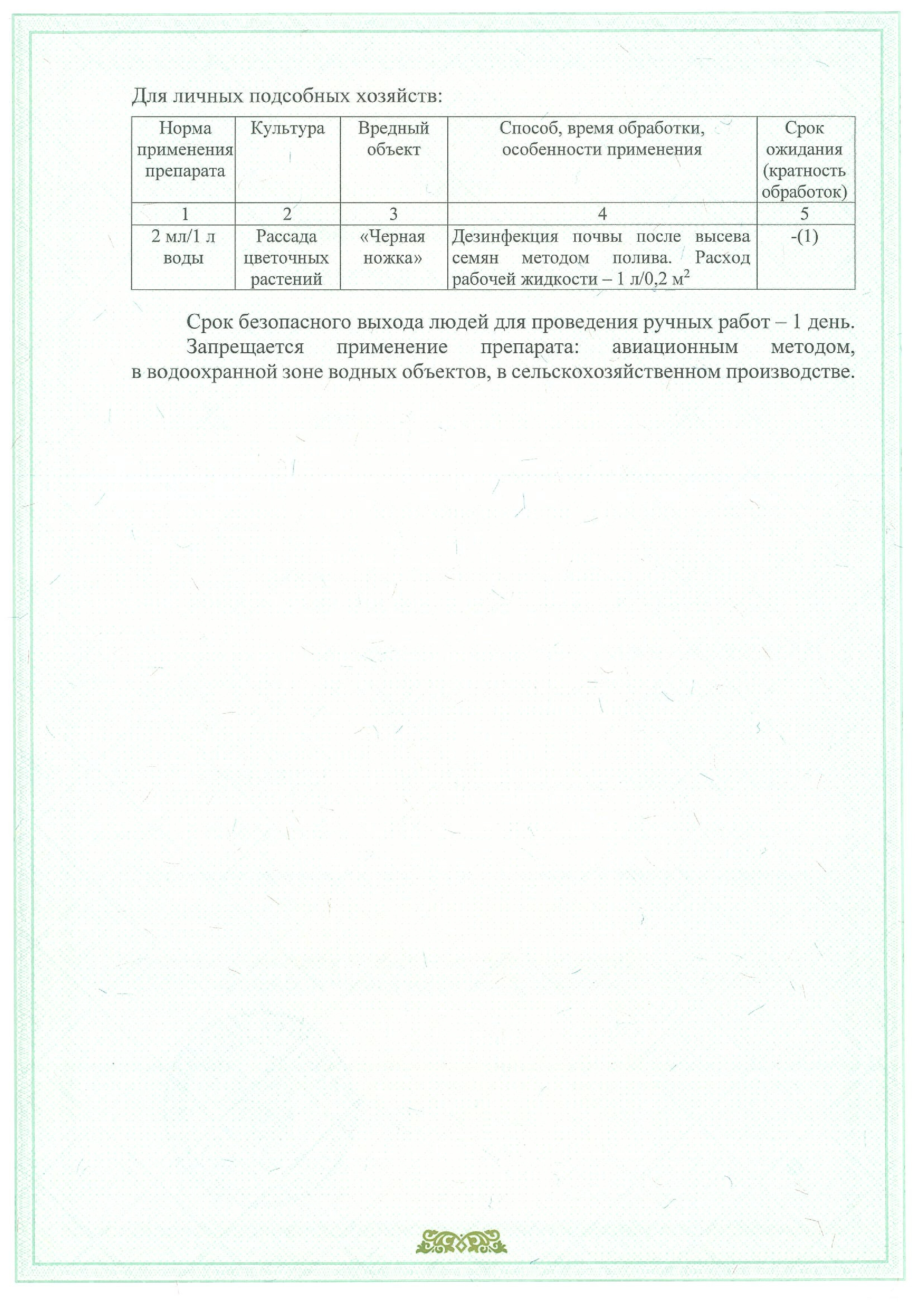 Рассада цветочных растений «Черная ножка» 2 мл/1 л воды Дезинфекция почвы после высева семян методом полива.Расход рабочей жидкости: 1 л/0,2 м2 1(-)