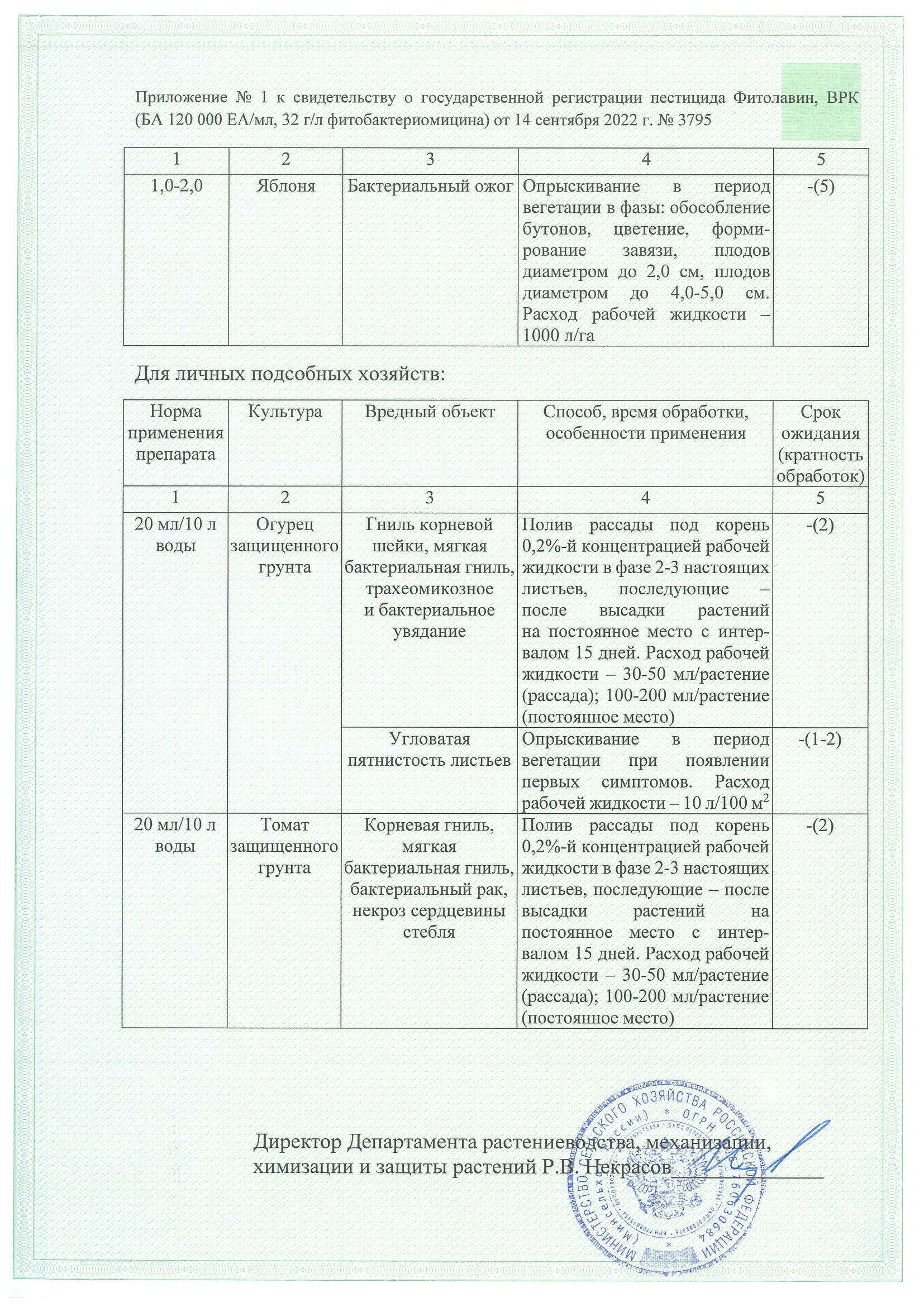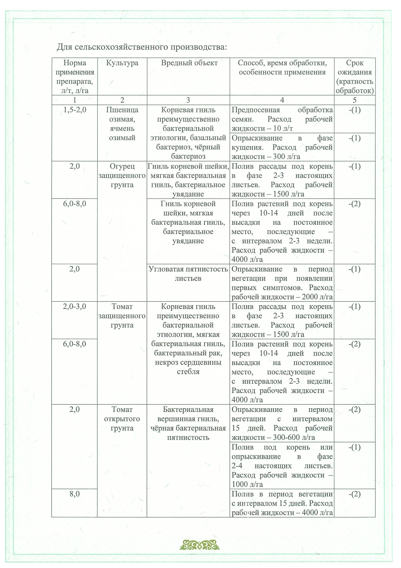 Огурец защищенного грунта Гниль корневой шейки, мягкая бактериальная гниль, бактериальное и трахеомикозное увядание 30–50 мл/растение (рассада); 100–200 мл/растение (на постоянном месте) Полив рассады под корень в фазе 2–3 настоящих листьев, далее — после высадки на постоянное место с интервалом 15 дней