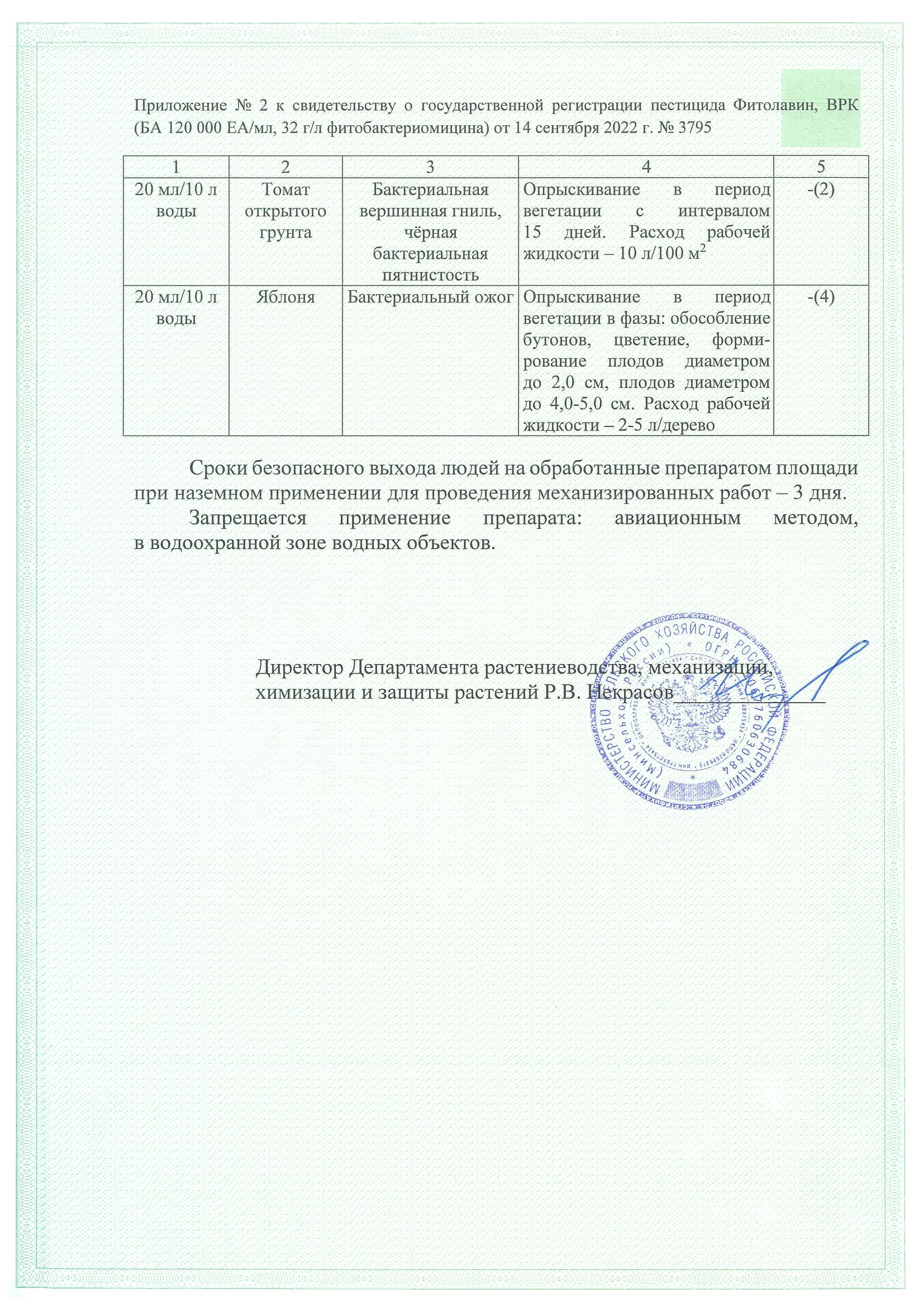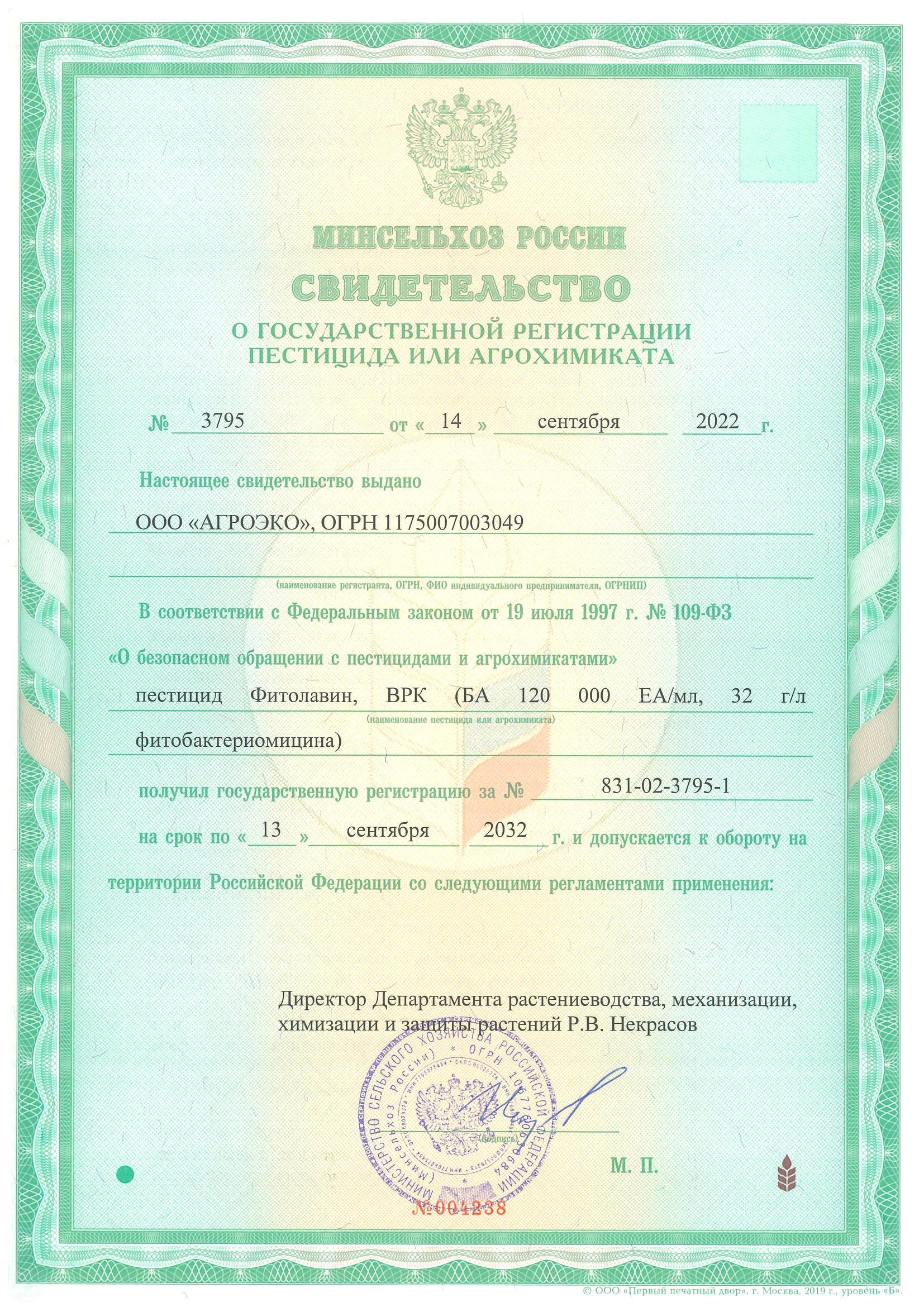 Государственная регистрация №831-02-3795-1 от 14.09.22 до 13.09.32 выдана МСХ РФ; Сертификация-информационное письмо №230-20/110 от 04.06.2020 г. выдано АО "РО по Сертификации и Тестированию"