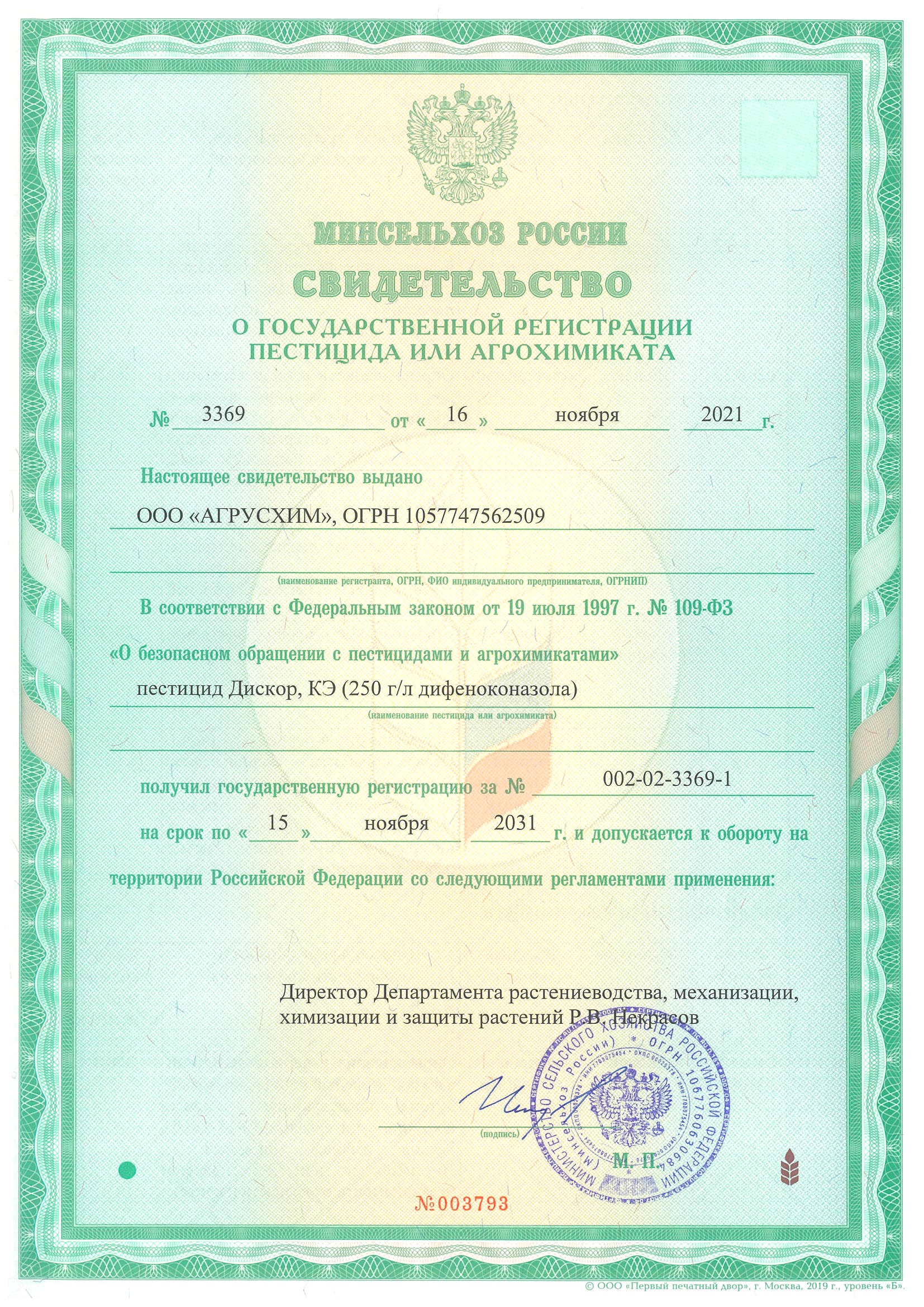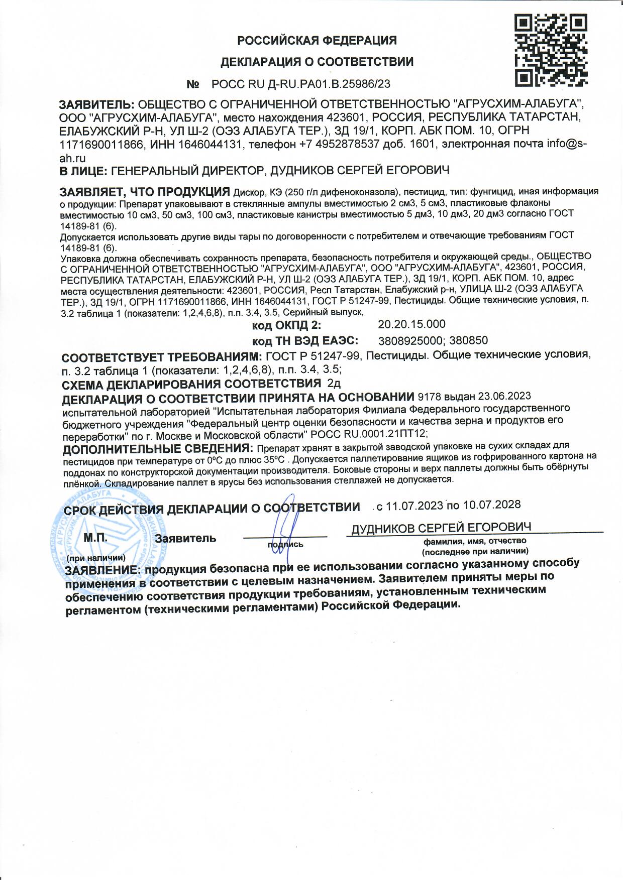 Государственная регистрация №002-02-3369-1 от 16.11.21 до 15.11.31 выдана МСХ РФ, Сертификация-декларация №РОСС RU Д-RU.РА01.В.25986/23 от 11.07.23 до 10.07.28 выдана Заявитель: ООО "Агрусхим-Алабуга"