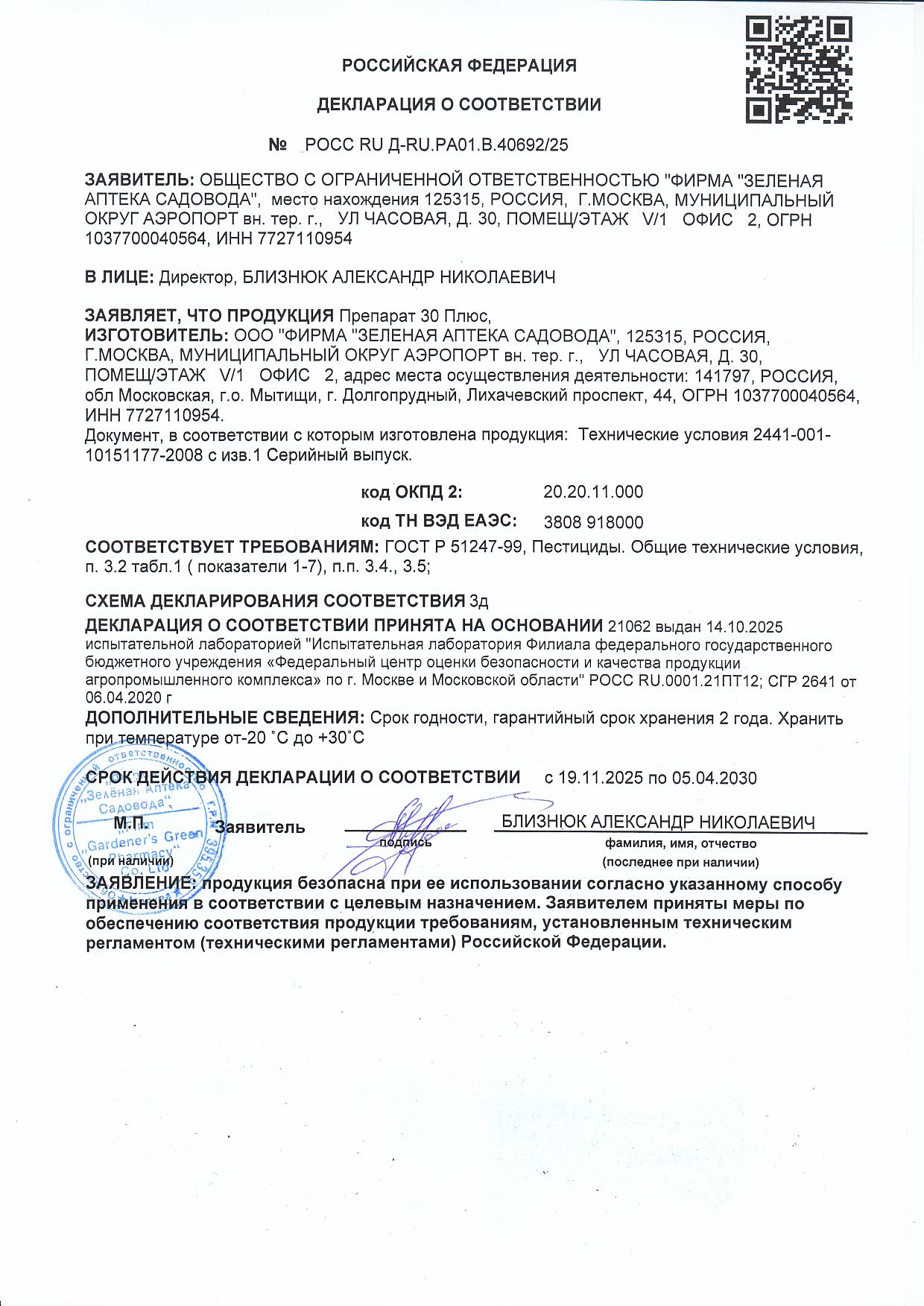препарат 30 плюс позволяет очистить сад от зимующих насекомых