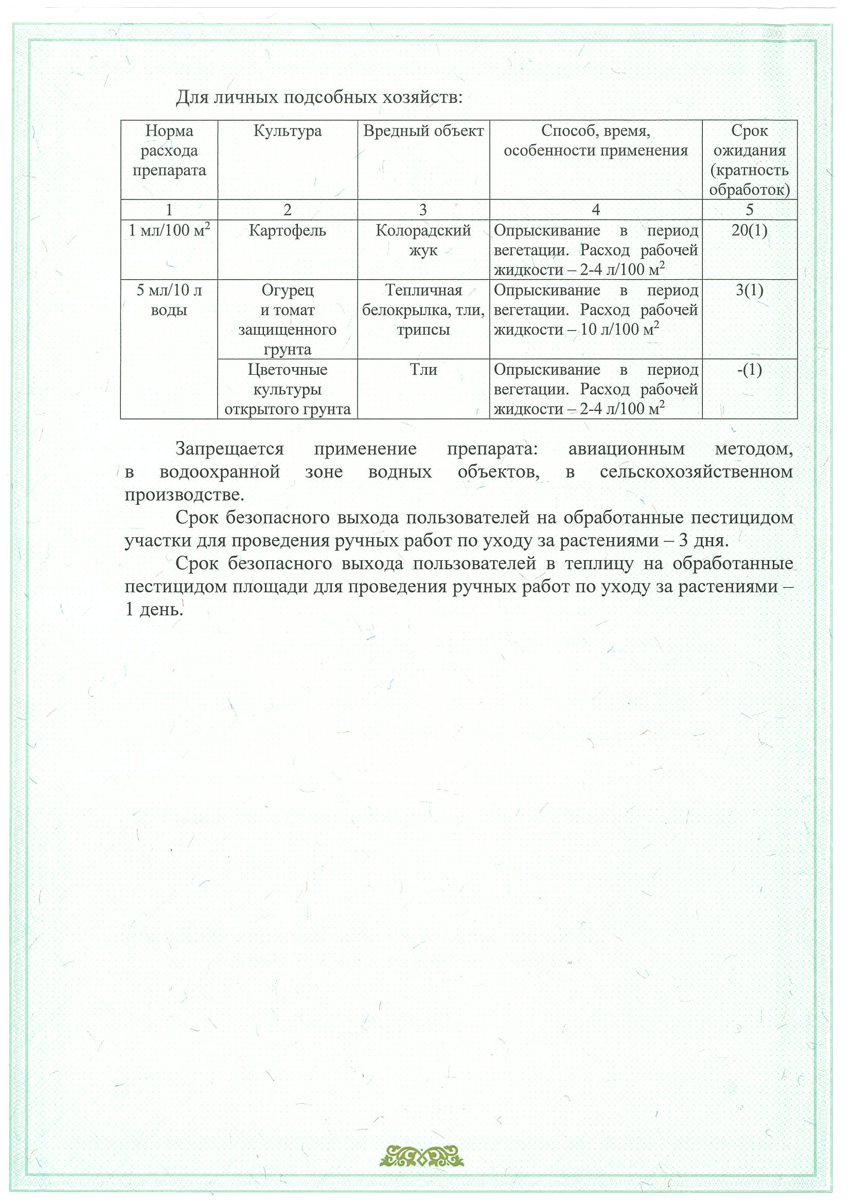 - огурцов на защищенном грунте от тепличной белокрылки ( 5 мл. на 10 л. – 100 кв.м);