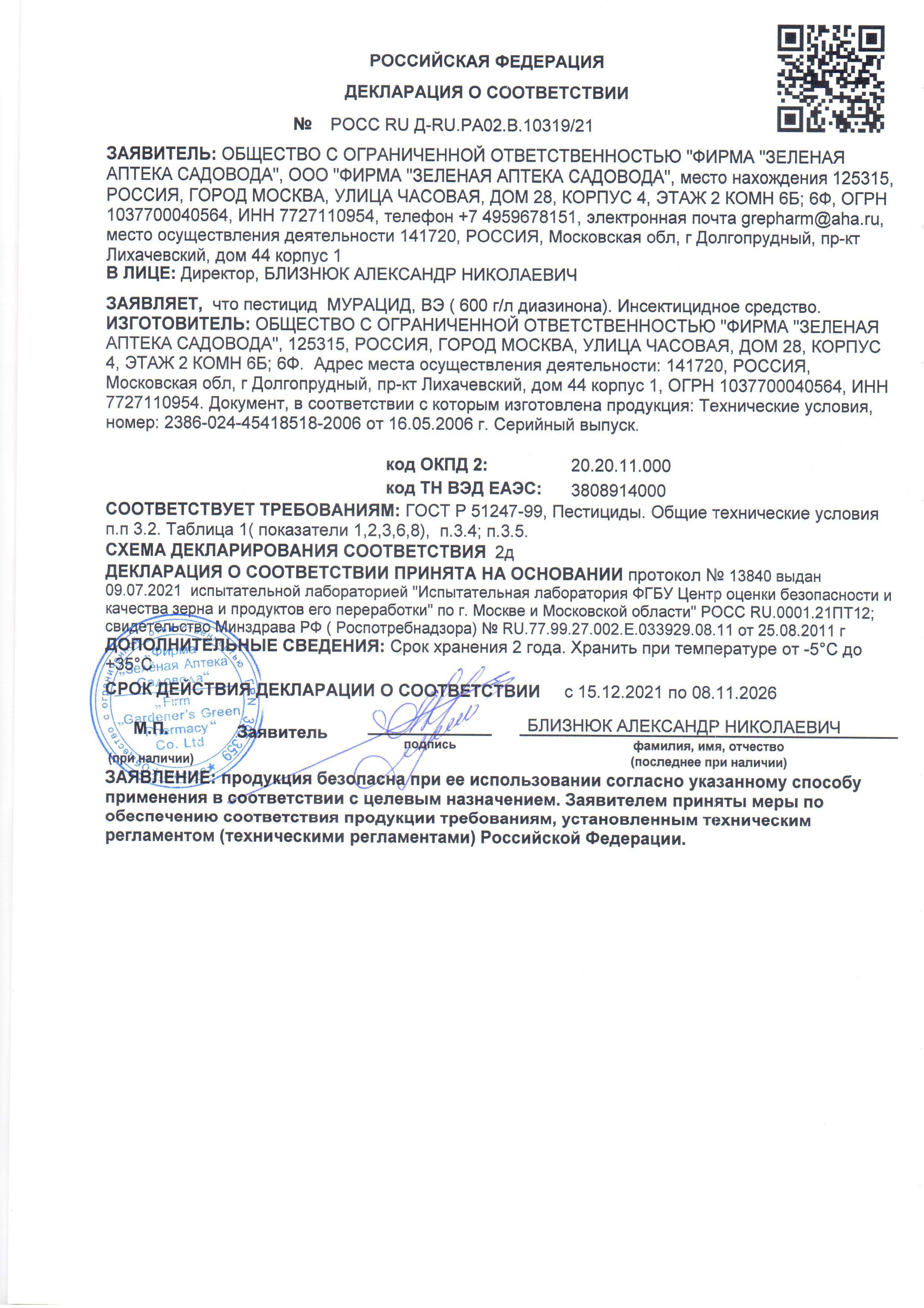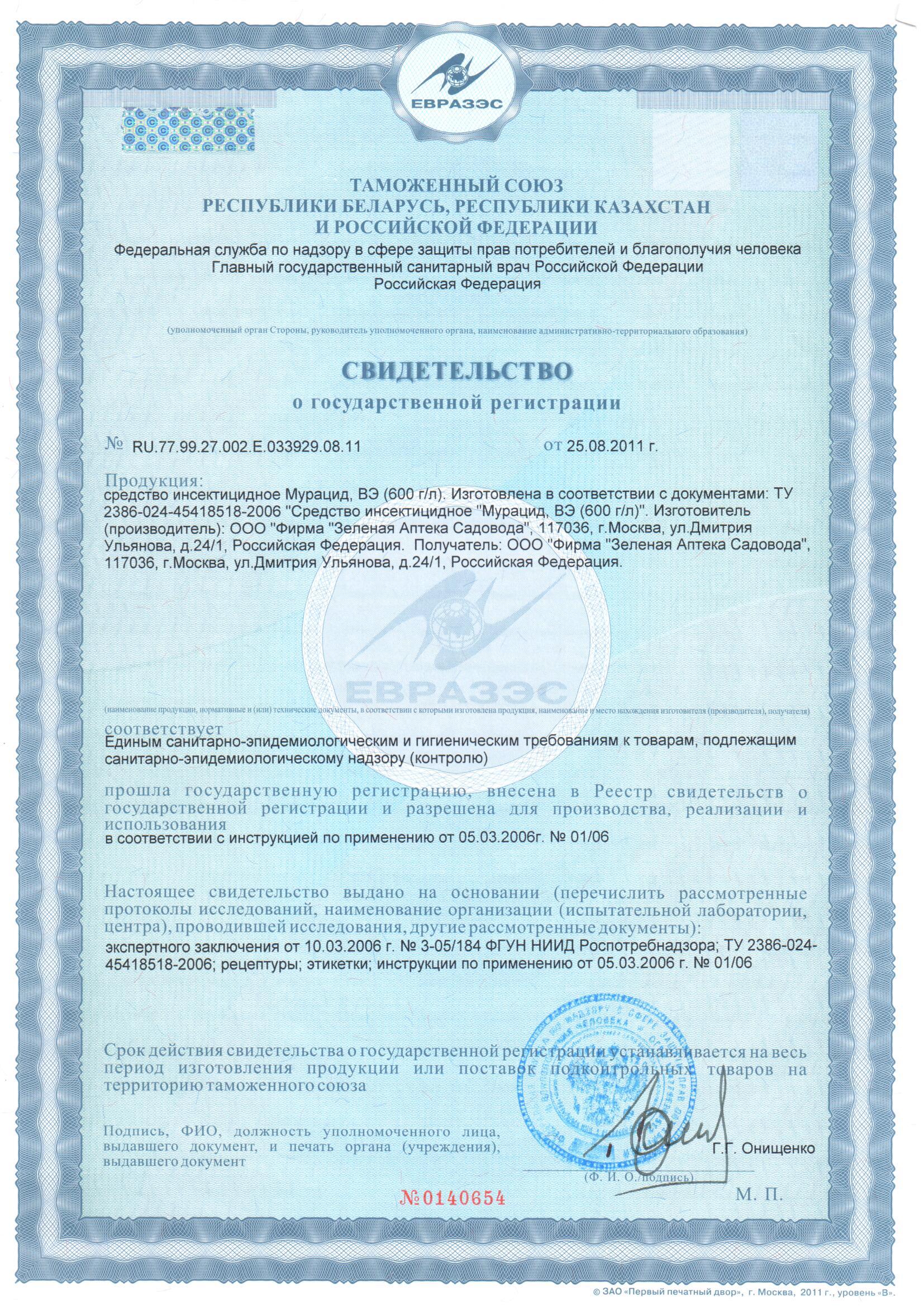 Государственная регистрация №RU.77.99.27.002.Е.033929.08.11, №0140654 от 25.08.11 выдана ФС по надзору в сфере защиты прав потребителей и благополучия человека; Сертификация-декларация №РОСС RU Д-RU.РА02.В.10319/21 от 15.12.21 до 08.11.26 выдана заявитель-ООО "Фирма Зеленая аптека садовода"