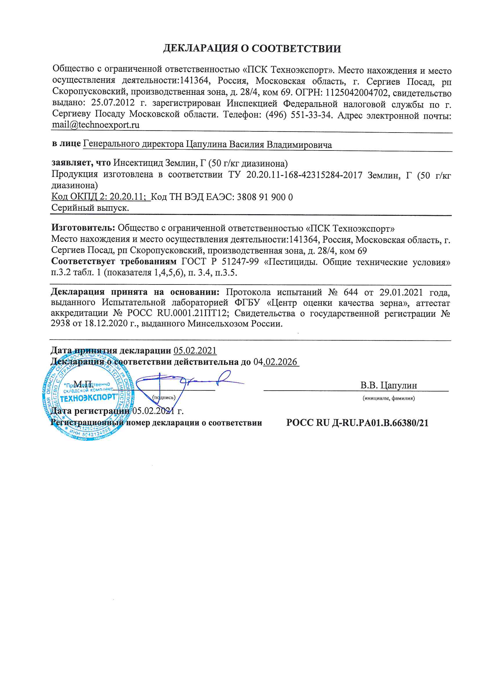 Государственная регистрация-№046-01-2938-1 от 18.12.2020 до 17.12.2030 выдана МСХ РФ, Сертификация-декларация № РОСС RU Д-RU.РА01.В.66380/21 от 05.02.21 до 04.02.26 выдана ООО "ПСК Техноэкспорт"
