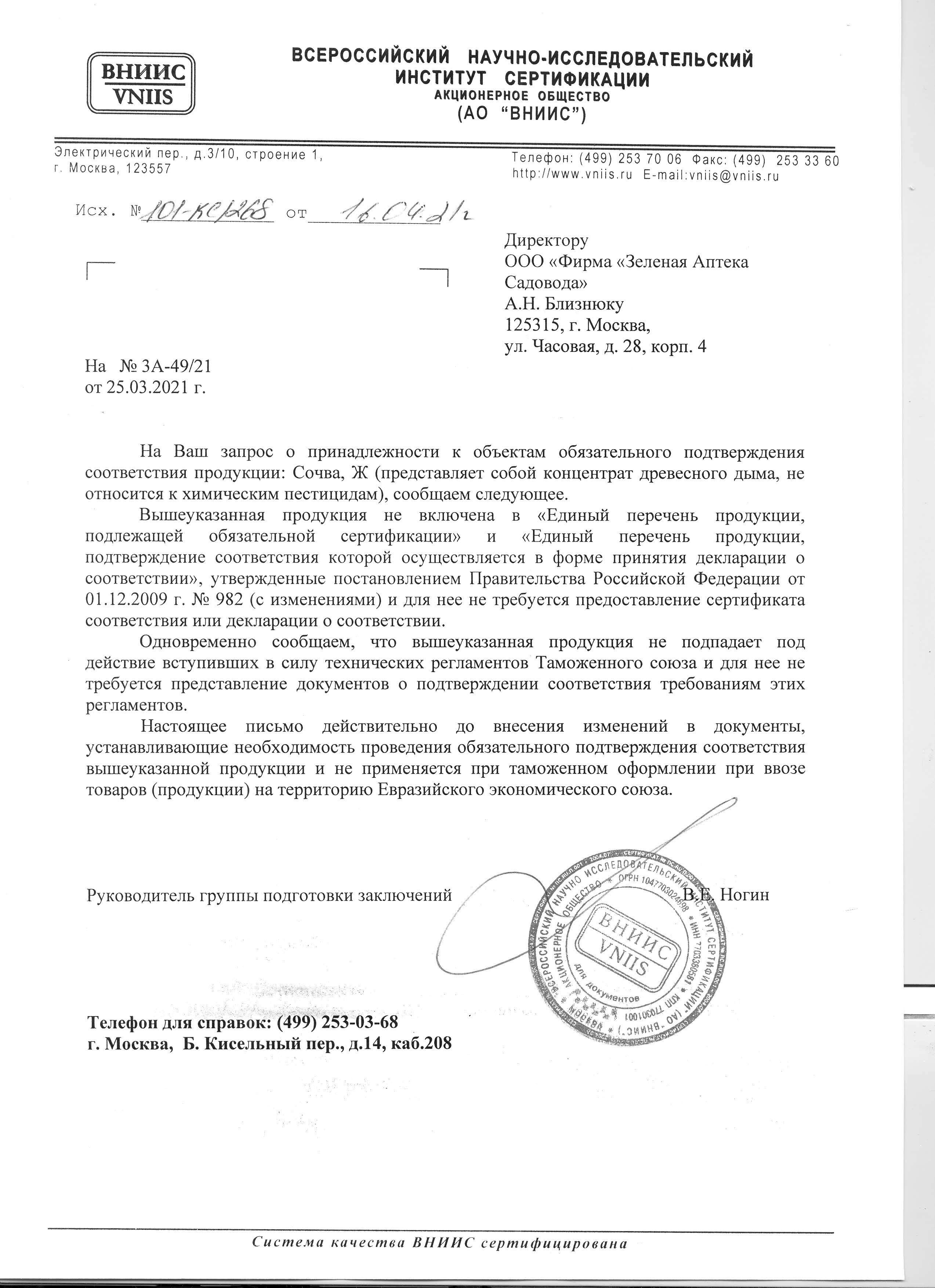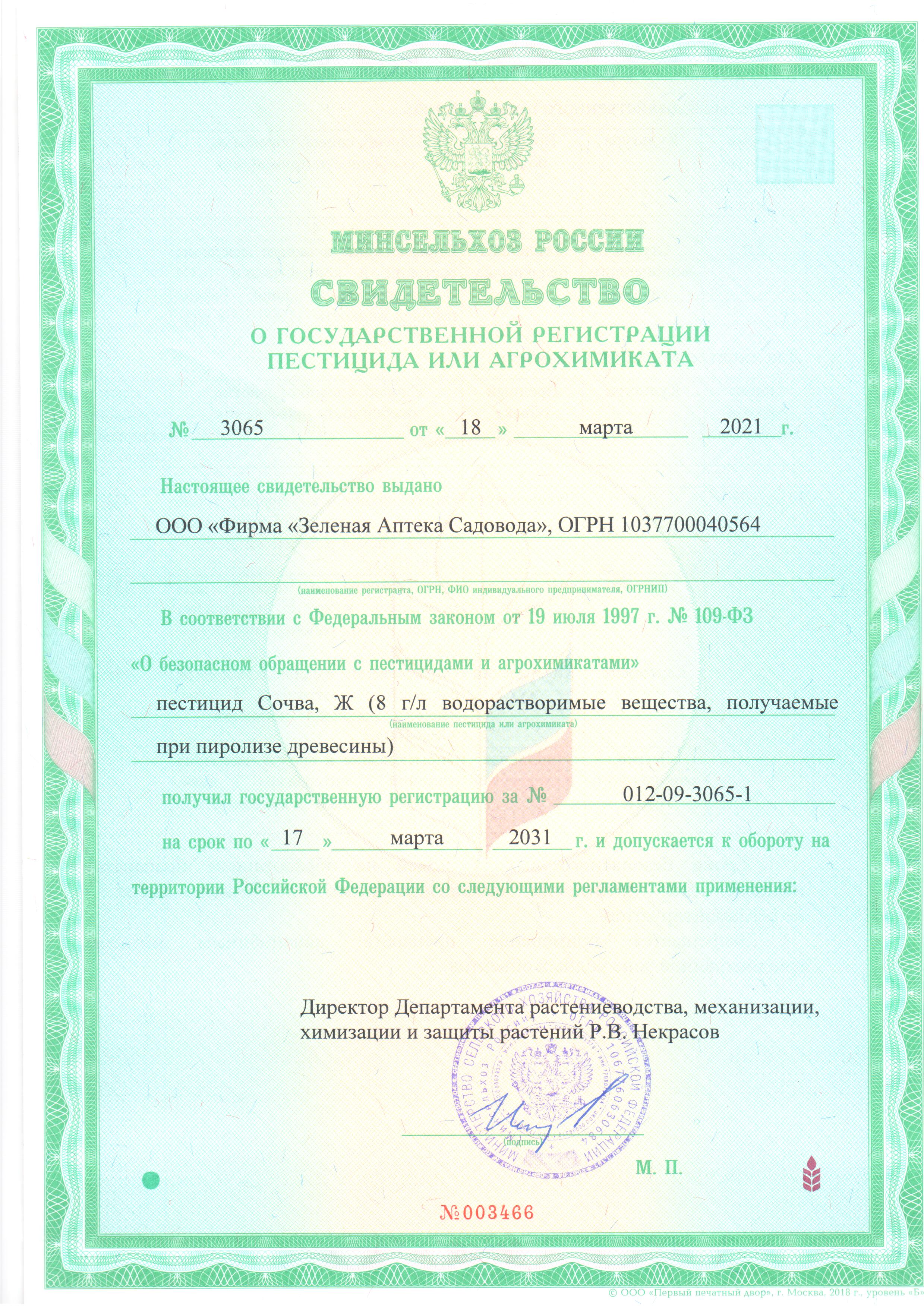 Государственная регистрация-№012-09-3065-1 от 18.03.21 до 17.03.31 выдана МСХ РФ, Сертификация-информационное письмо №101-кс/268 от 16.04.21 выдано ВНИИС