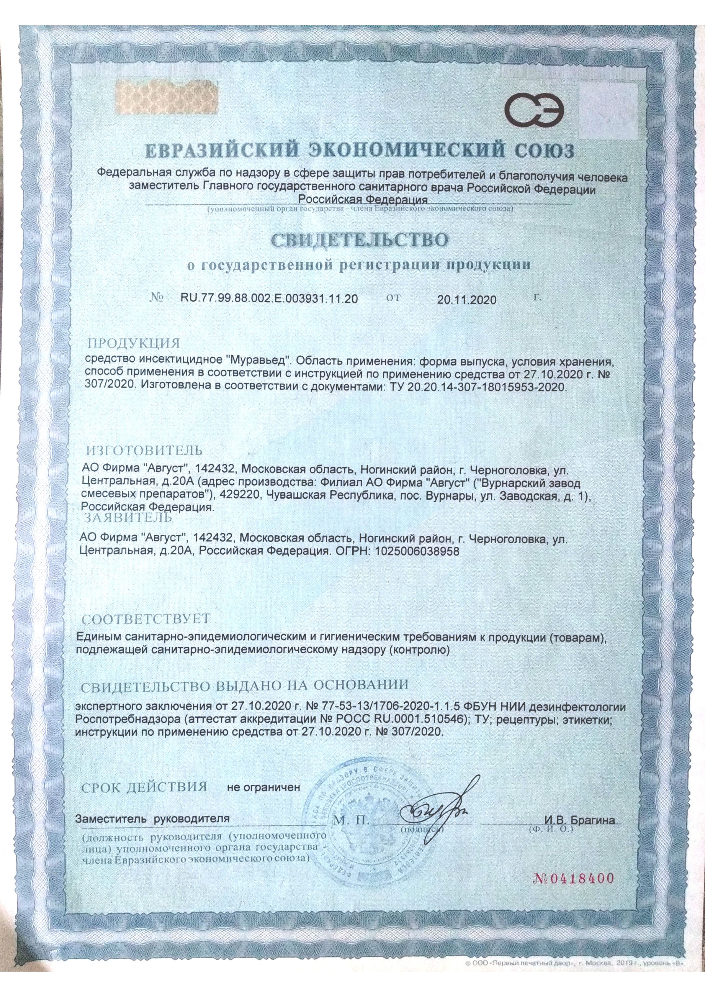 Муравьед» — препарат контактно-кишечного действия. Применяется на приусадебных участках, отмостках домов, в щелях между садовыми плитами. Он попадает в организм насекомых, оказывая губительное влияние на их нервную систему: вызывает торможение мышечной деятельности, судороги, а затем полный паралич. Положительные особенности препарата — отсутствие привыкания к нему муравьев и экономичный расход. Муравьи исчезают в течение не более трех суток после обработки. Защитный эффект сохраняется на протяжении не менее 3 недель.