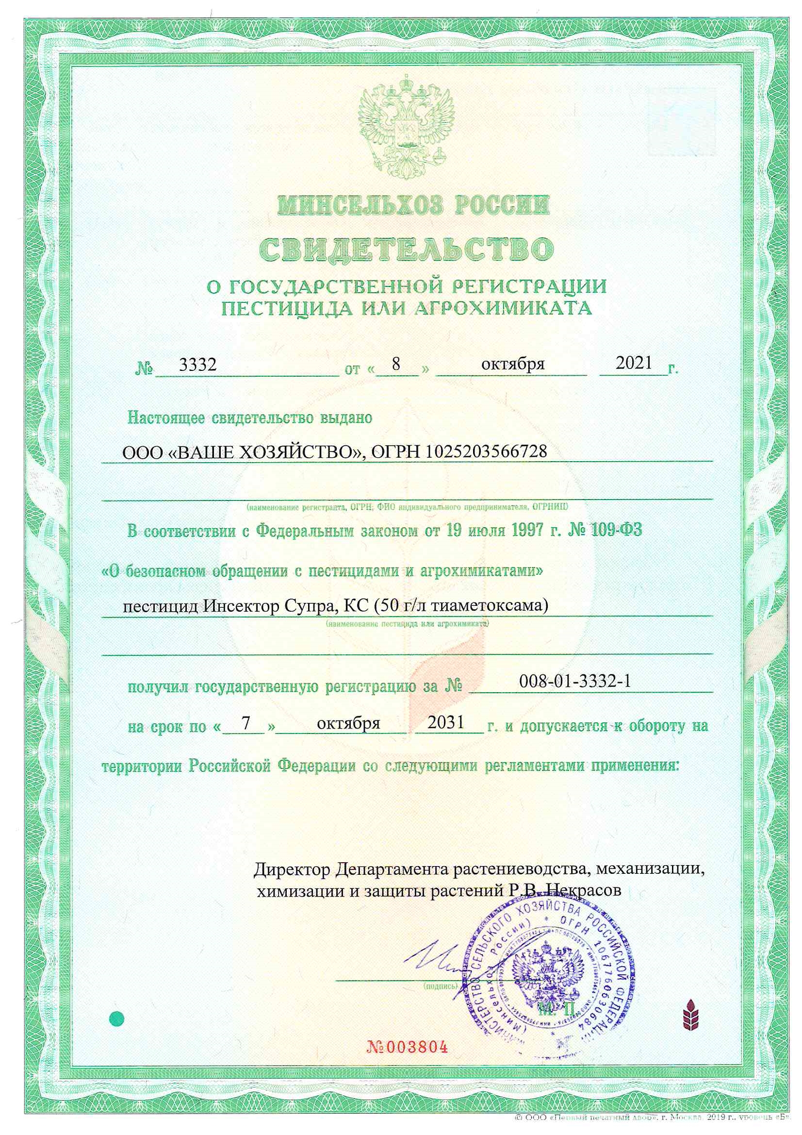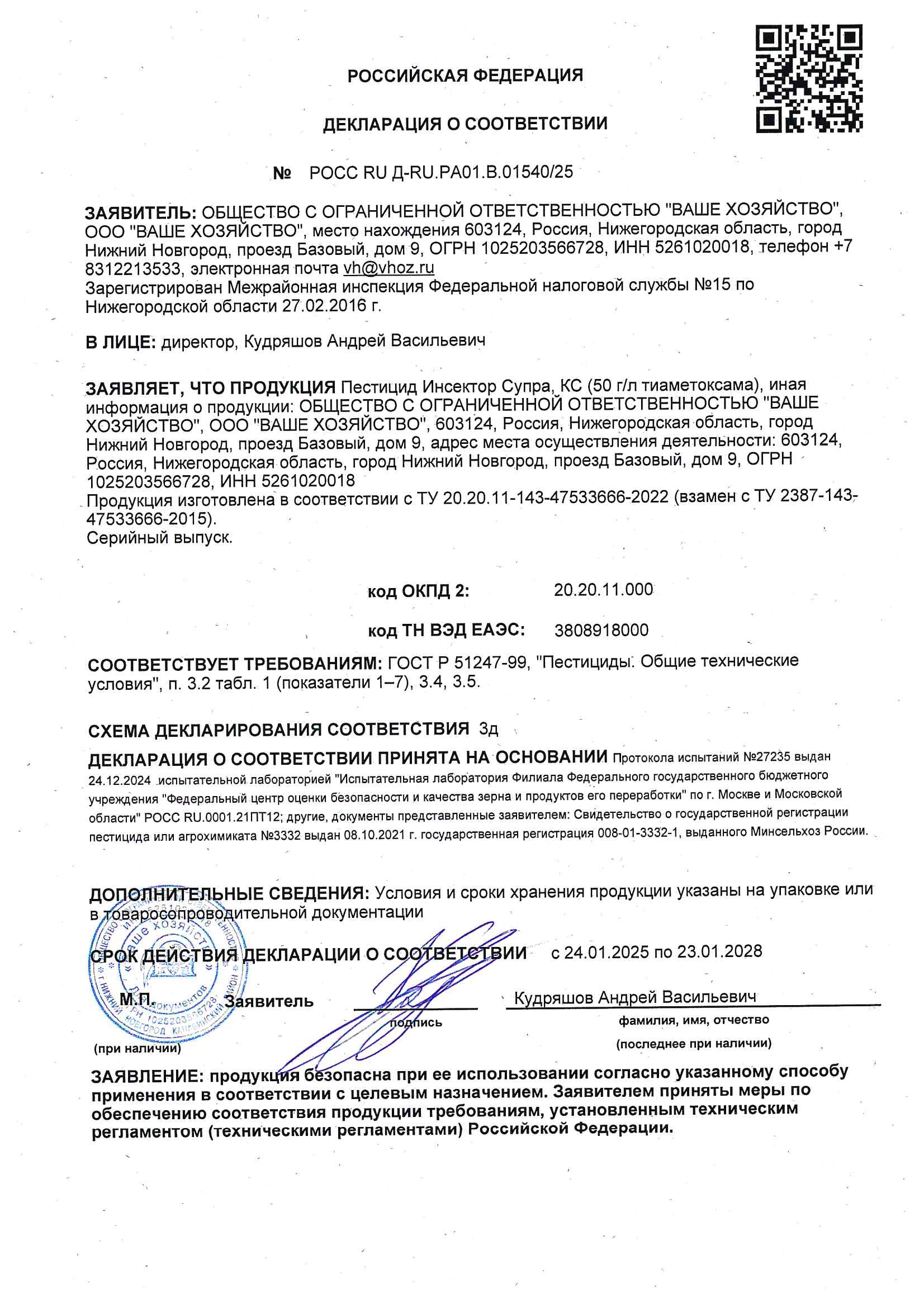 Пестицид Инсектор Супра, КС (50 г/л тиаметоксама). Инсектицид.