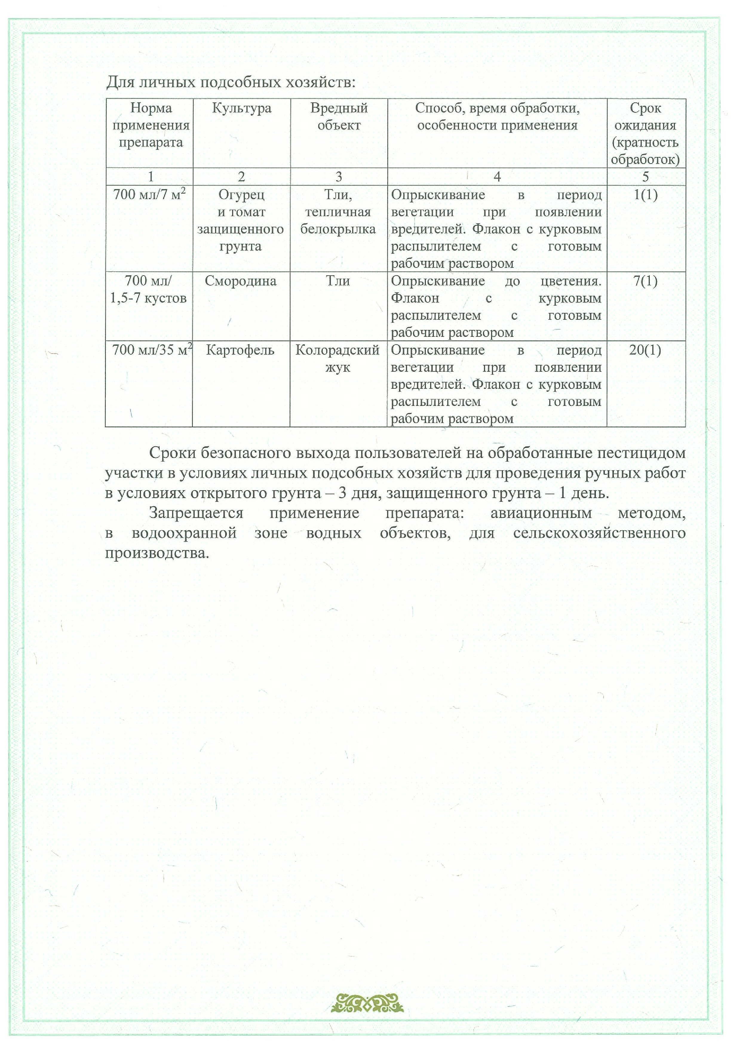 Взрослые насекомые и личинки разных возрастов погибают в течение нескольких часов после обработки, и далее защитное действие сохраняется от 14 до 21 суток. Таким образом, в течение 2-3 недель ваши растения защищены от насекомых, которые могут отродиться из яйцекладок, переместиться с соседних