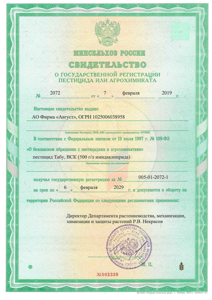 -Табу 4 мл - зарекомендовавший себя инсектицид от колорадского жука и проволочника на основе имидаклоприда. Вызывает потерю двигательной активности, прекращение питания и гибель вредителей в течение суток при попытке поедания клубней или ботвы. Защищает на срок до 45 дней.