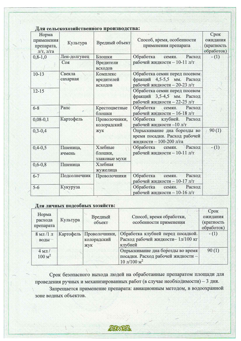 Используется в виде баковой смеси, которую легко приготовить самостоятельно, следуя инструкции. Рабочий раствор представляет собой однородную суспензию красного цвета. Упаковка рассчитана на обработку 50 кг посадочного картофеля.