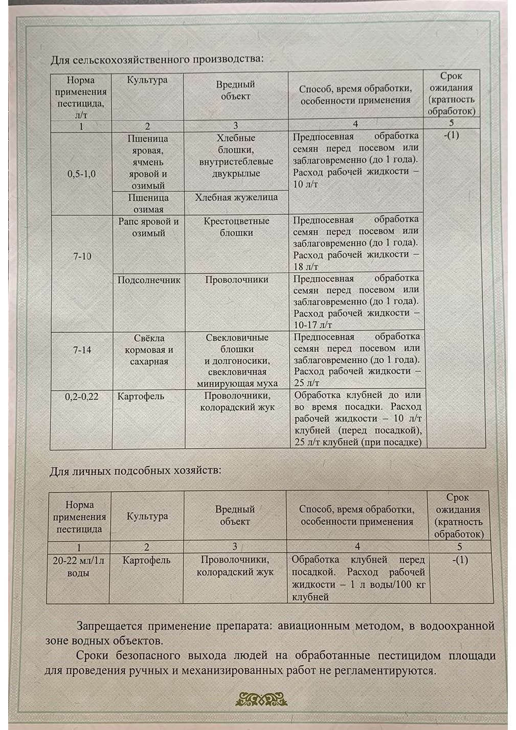 Способ, время, особенности применения препарата: Обработка клубней перед посадкой. Расход рабочей жидкости 1 л воды/100 кг клубней