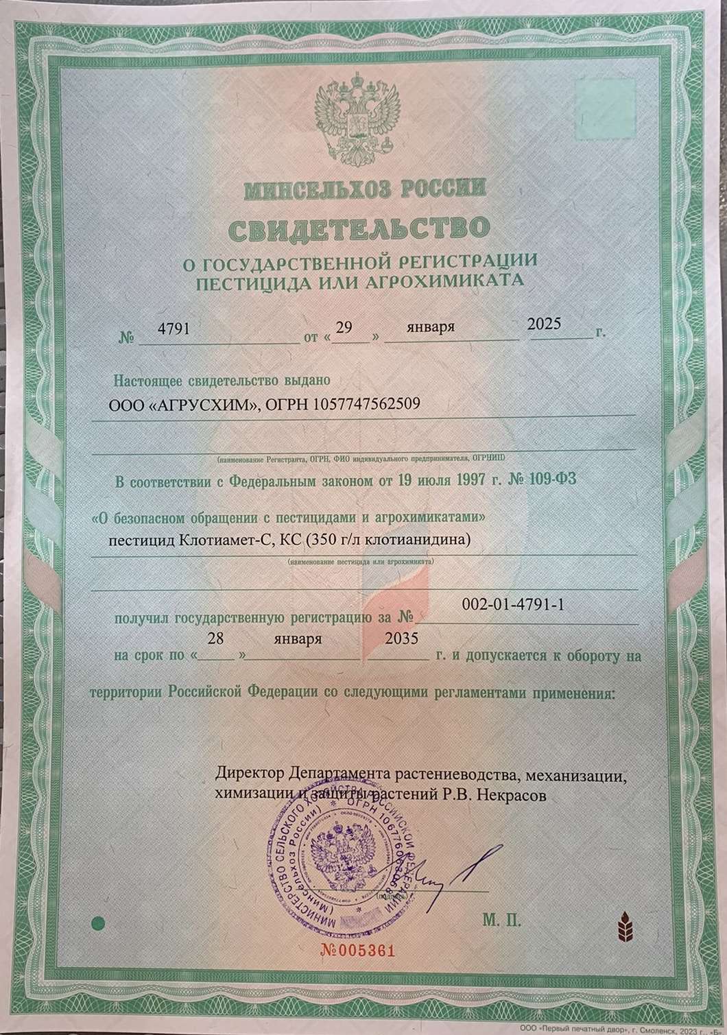 Действующее вещество: 350 г/л клотианидина