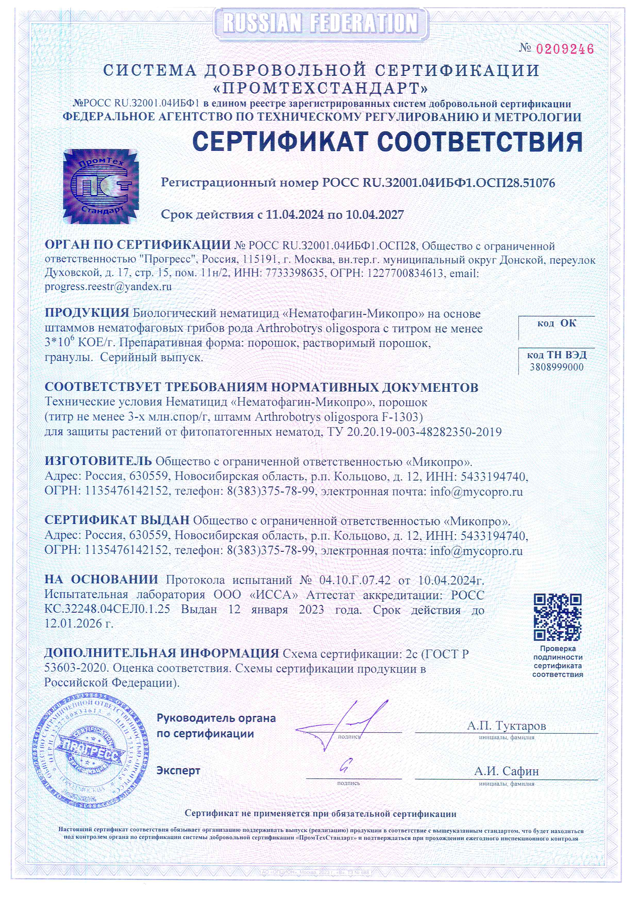 Органический биопрепарат-удобрение Нематофагин-Микопро® - биологический нематицид против паразитических нематод – галловой, стеблевой, цистообразующей, золотистой, свекловичной, проникающей короткотелой и др. почвенных нематод. Препарат действует как на подвижные личинки нематод в почве, так и на яйца, защищенные цистами. Предотвращает снижение иммунитета растений к патогенам, усиливает питание.