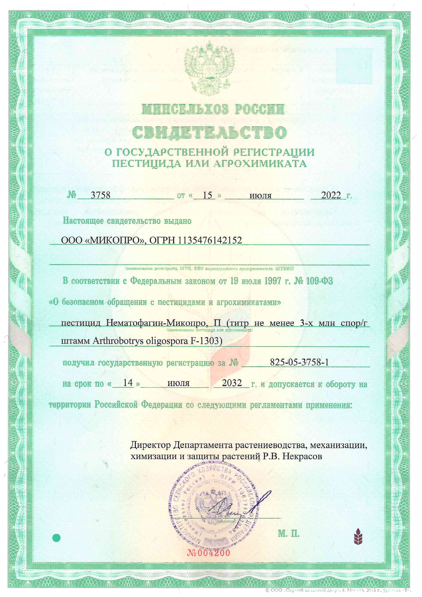 Действующее вещество: консорциум штаммов нематофаговых грибов рода Arthrobotrys oligospora c титром не менее 3*106 КОЕ/г.