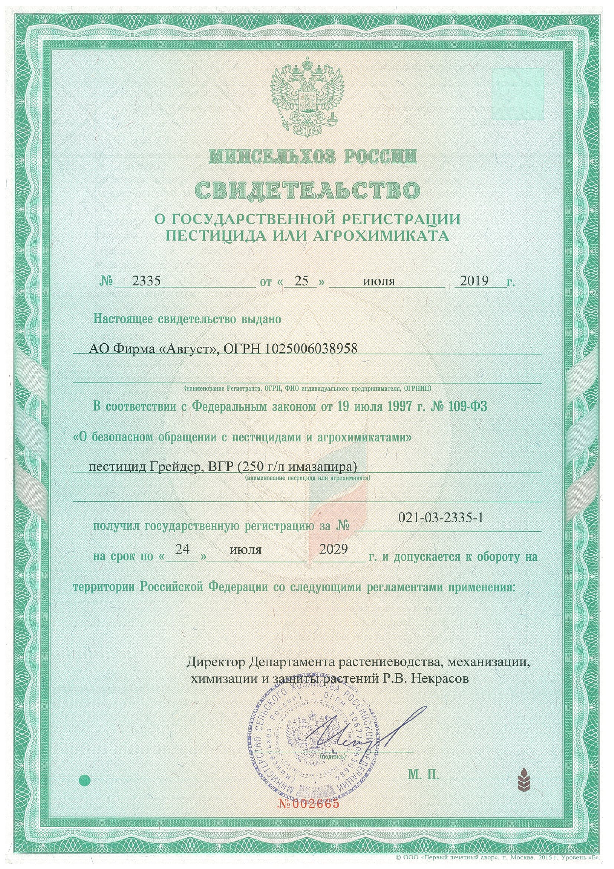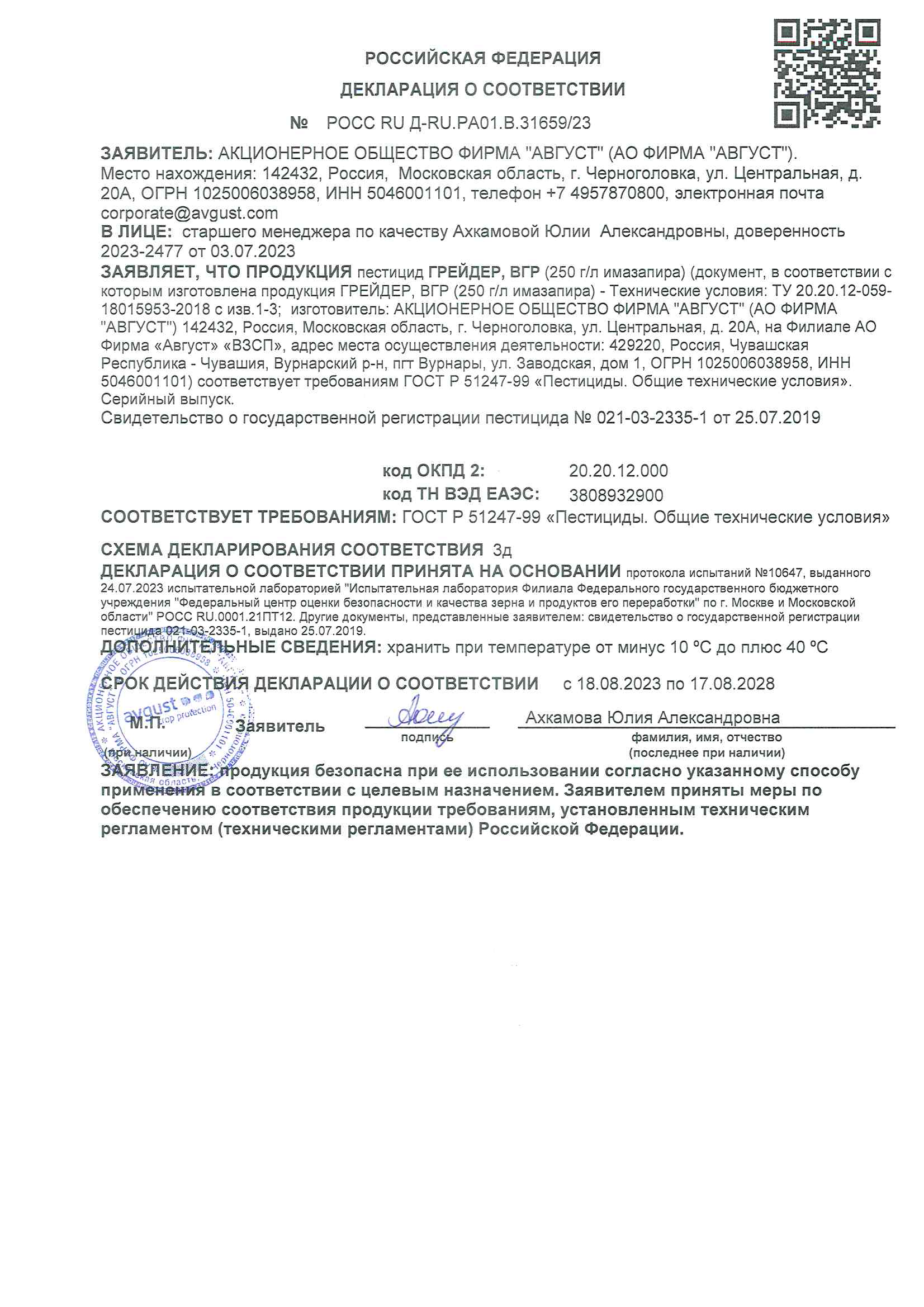 Государственная регистрация №021-03-2335-1 от 25.07.19 до 24.07.29 выдана МСХ , Сертификация -декларация №РОСС RU Д-RU.РА01.В.31659/23 от 18.08.23 до 17.08.28 выдана Заявитель: АО "Август"